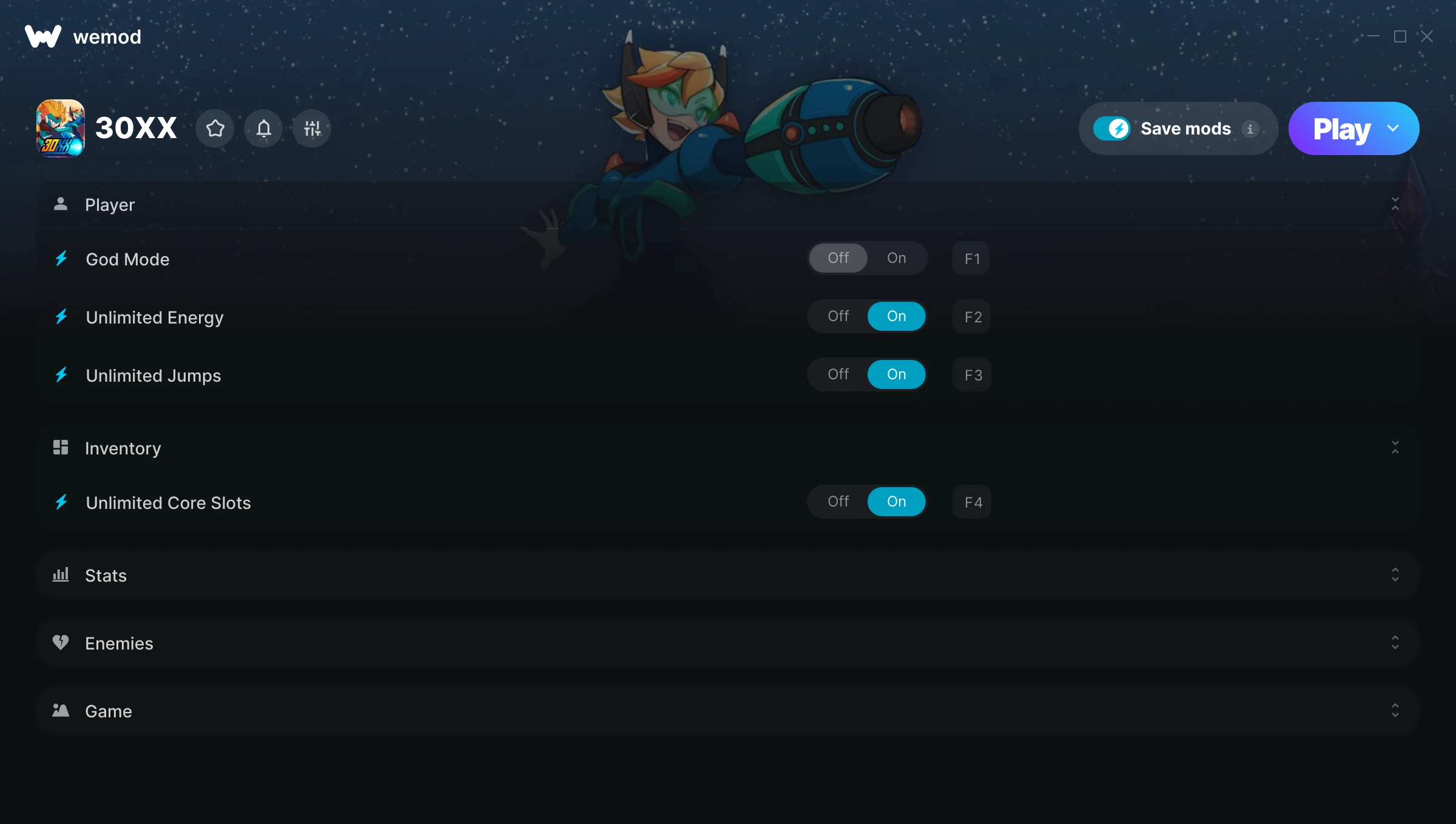 How do I use the cheats in 30XX?WeMod will safely display all of the games on your PC. Open a game from the list and simply press play. After the game loads and once you’re in-game, you can start enabling different cheats!Will this work with my game version?WeMod uses advanced technology to detect the game version you’re running and will let you know if it’s supported. If it’s not, you will still have the option of giving it a try or requesting an update!