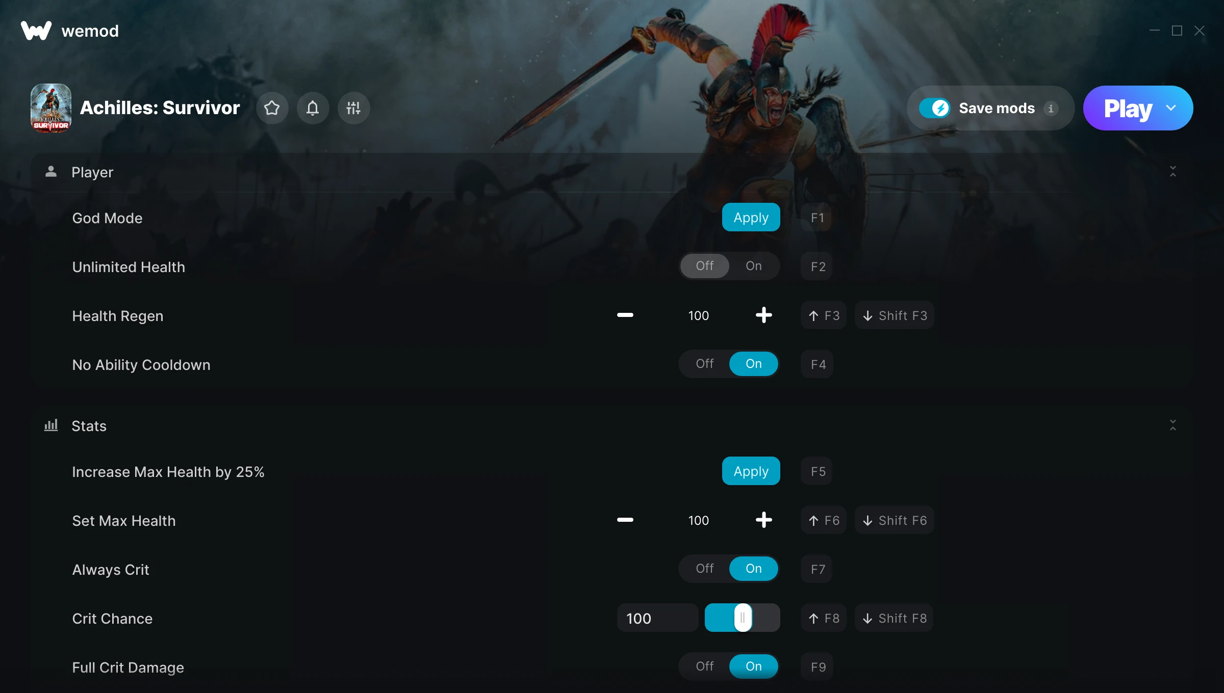 How do I use the cheats in Achilles: Survivor?WeMod will safely display all of the games on your PC. Open a game from the list and simply press play. After the game loads and once you’re in-game, you can start enabling different cheats!Will this work with my game version?WeMod uses advanced technology to detect the game version you’re running and will let you know if it’s supported. If it’s not, you will still have the option of giving it a try or requesting an update!