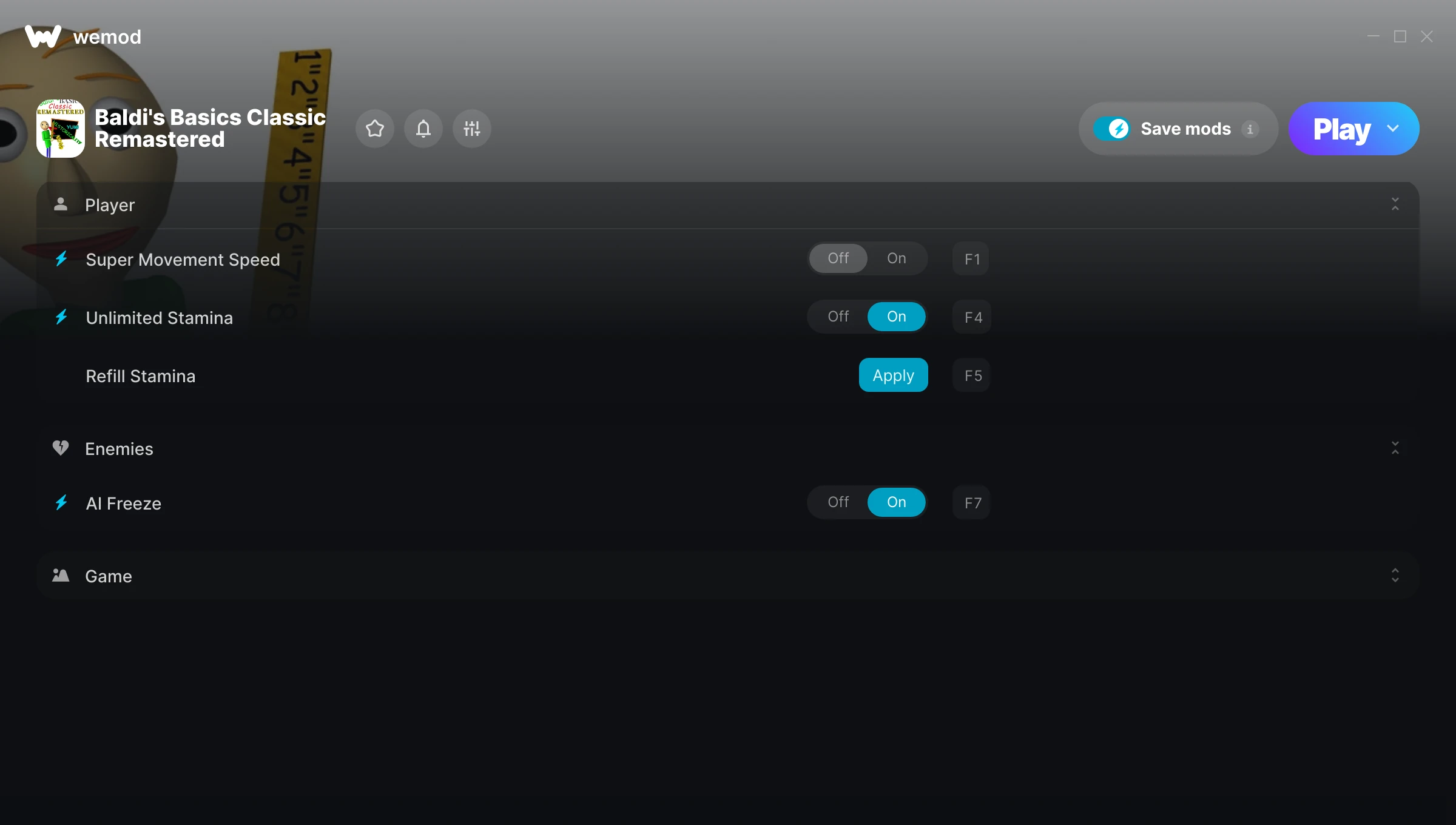 How do I use the cheats in Baldi's Basics Classic Remastered?WeMod will safely display all of the games on your PC. Open a game from the list and simply press play. After the game loads and once you’re in-game, you can start enabling different cheats!Will this work with my game version?WeMod uses advanced technology to detect the game version you’re running and will let you know if it’s supported. If it’s not, you will still have the option of giving it a try or requesting an update!