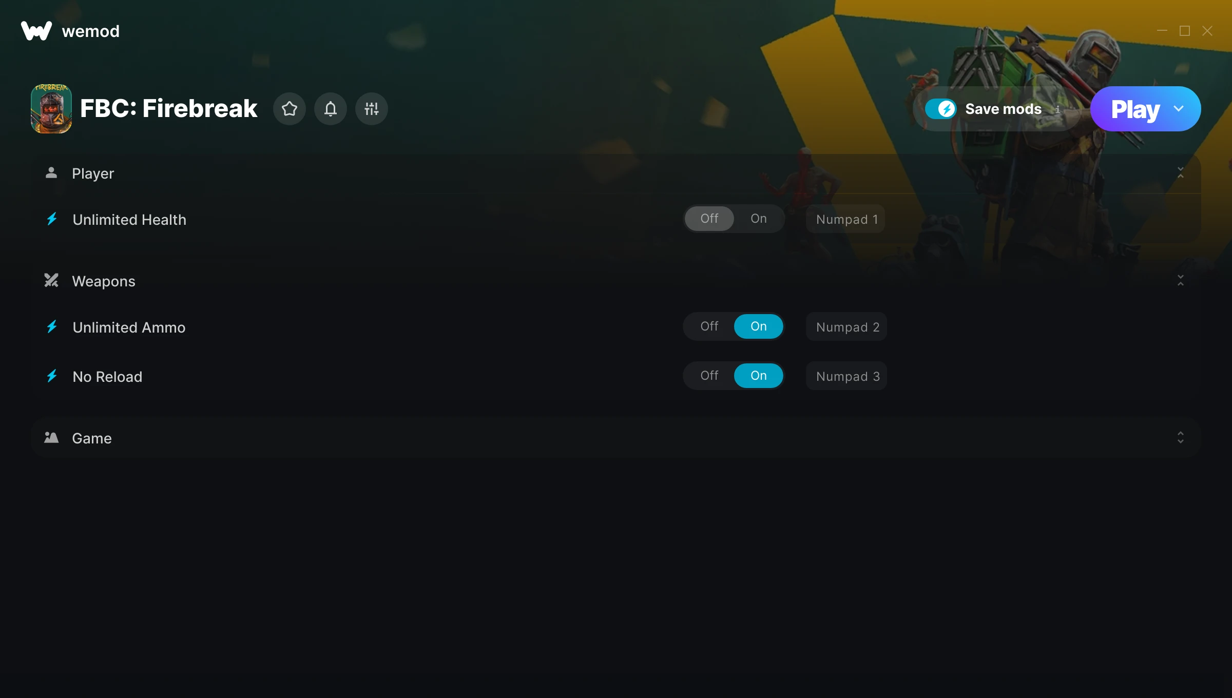 How do I use the cheats in FBC: Firebreak?WeMod will safely display all of the games on your PC. Open a game from the list and simply press play. After the game loads and once you’re in-game, you can start enabling different cheats!Will this work with my game version?WeMod uses advanced technology to detect the game version you’re running and will let you know if it’s supported. If it’s not, you will still have the option of giving it a try or requesting an update!