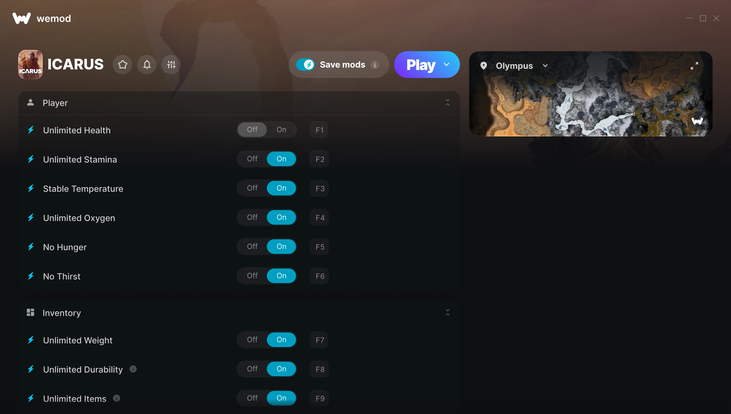 Thank you WeMod for a great trainer. It helps tremendously with my game play and makes the game so much more enjoyable as I can play the way I want to play. I must say, without WeMod, I would not play Icarus as it is very tough for single players.