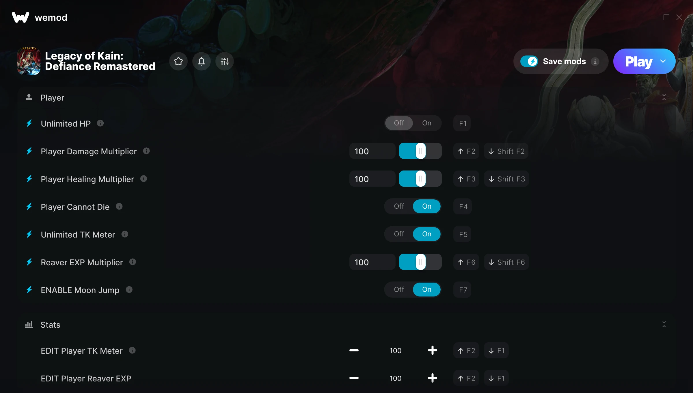 How do I use the cheats in Legacy of Kain: Defiance Remastered?WeMod will safely display all of the games on your PC. Open a game from the list and simply press play. After the game loads and once you’re in-game, you can start enabling different cheats!Will this work with my game version?WeMod uses advanced technology to detect the game version you’re running and will let you know if it’s supported. If it’s not, you will still have the option of giving it a try or requesting an update!