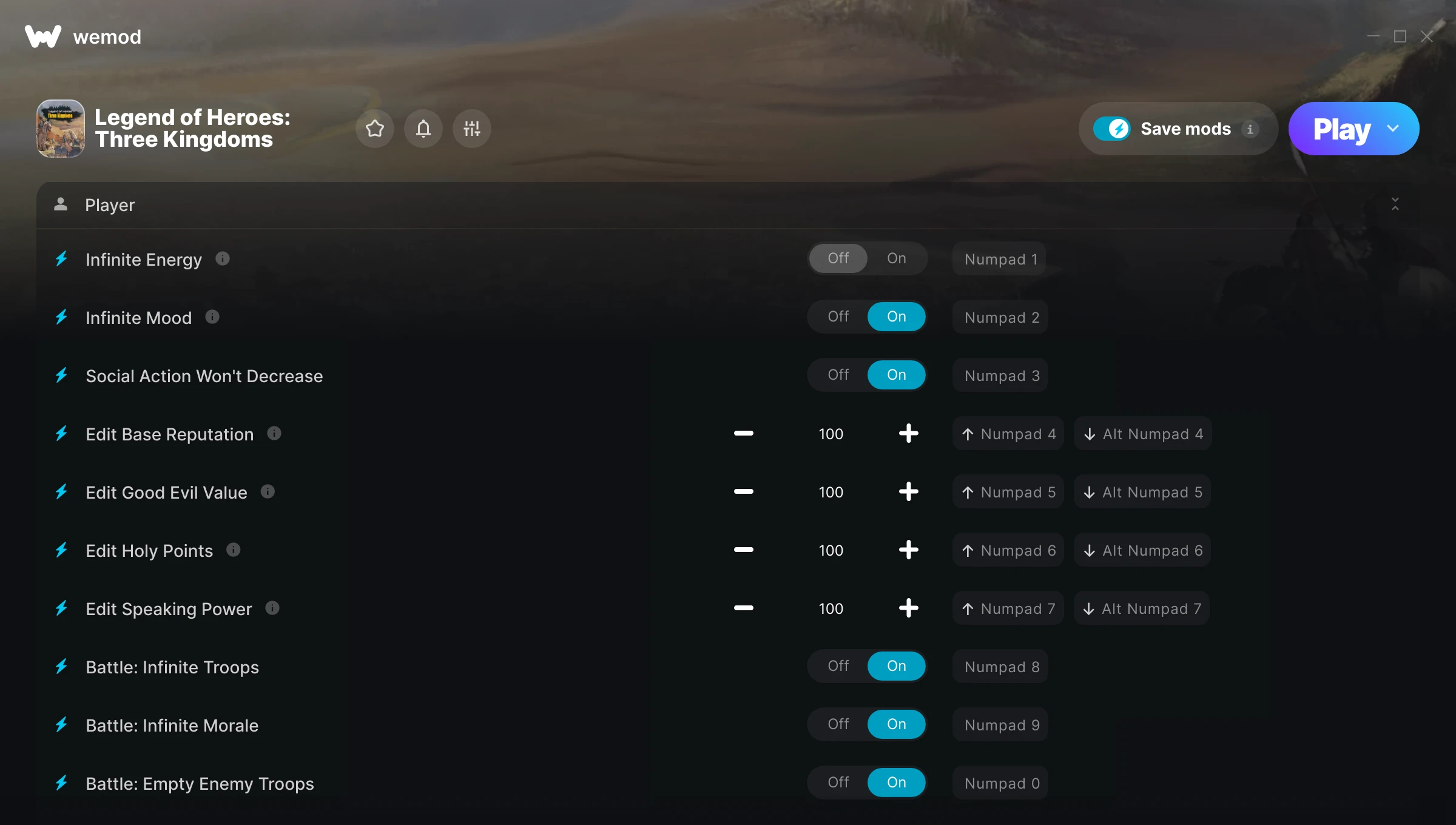 How do I use the cheats in Legend of Heroes: Three Kingdoms?WeMod will safely display all of the games on your PC. Open a game from the list and simply press play. After the game loads and once you’re in-game, you can start enabling different cheats!Will this work with my game version?WeMod uses advanced technology to detect the game version you’re running and will let you know if it’s supported. If it’s not, you will still have the option of giving it a try or requesting an update!