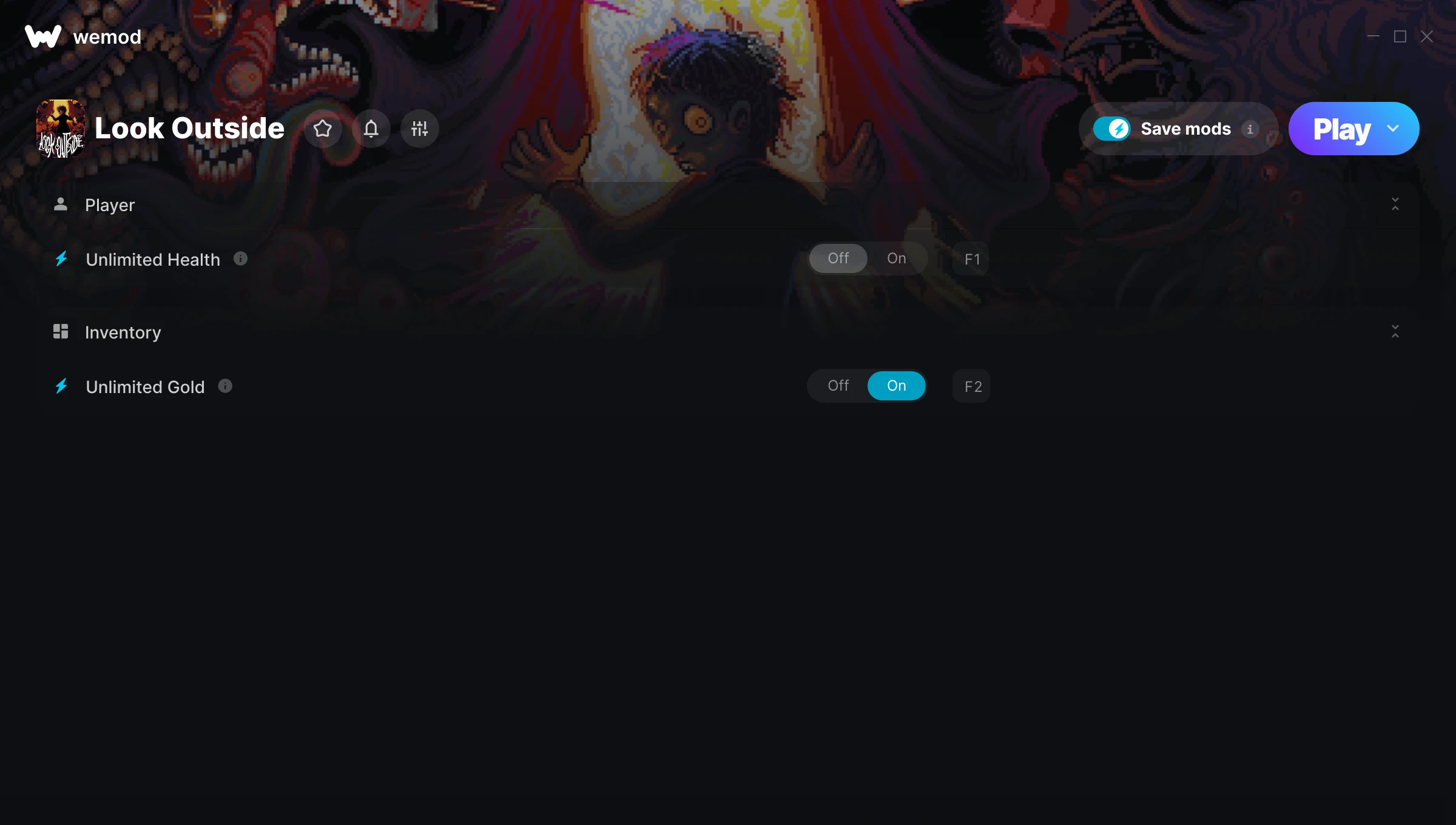 How do I use the cheats in Look Outside?WeMod will safely display all of the games on your PC. Open a game from the list and simply press play. After the game loads and once you’re in-game, you can start enabling different cheats!Will this work with my game version?WeMod uses advanced technology to detect the game version you’re running and will let you know if it’s supported. If it’s not, you will still have the option of giving it a try or requesting an update!