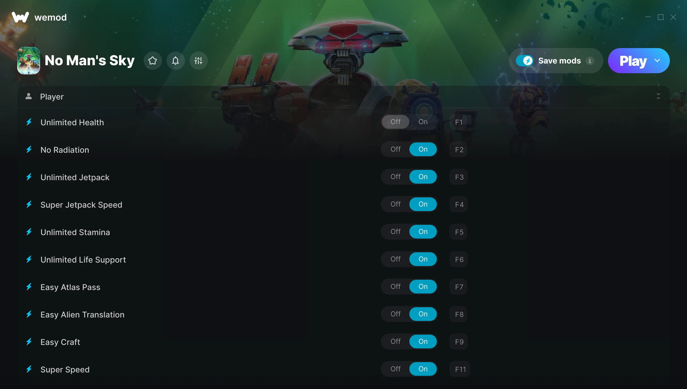 Thank you for making these cheats, it really helps with survival on the higher difficulties. However a few cheats don't work, such as super jetpack speed, unlimited stamina, infinite ammo, no reload, and the unlimited starship health makes it so i can't recharge its shield, causing it to constantly beep