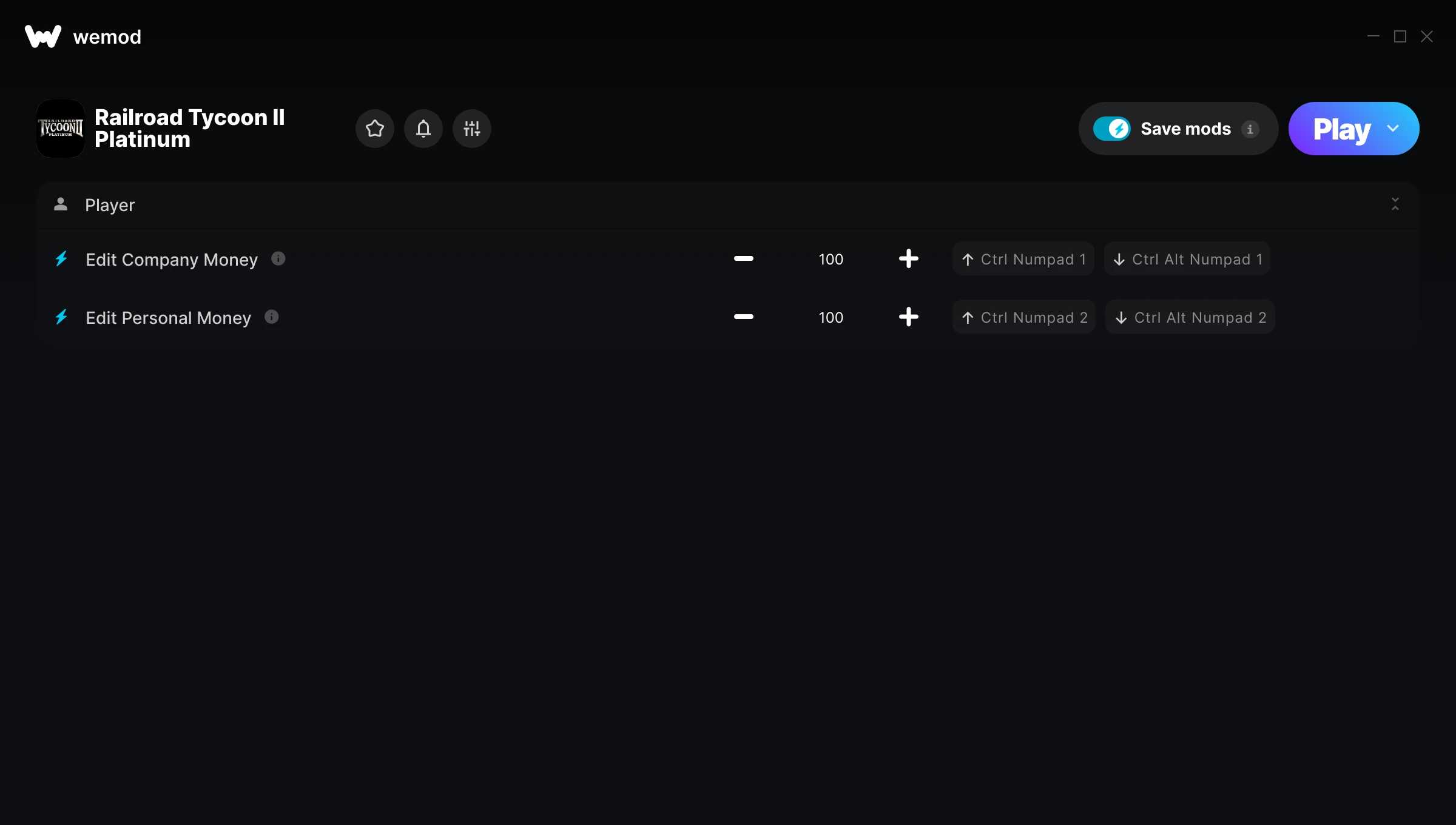How do I use the cheats in Railroad Tycoon II Platinum?WeMod will safely display all of the games on your PC. Open a game from the list and simply press play. After the game loads and once you’re in-game, you can start enabling different cheats!Will this work with my game version?WeMod uses advanced technology to detect the game version you’re running and will let you know if it’s supported. If it’s not, you will still have the option of giving it a try or requesting an update!