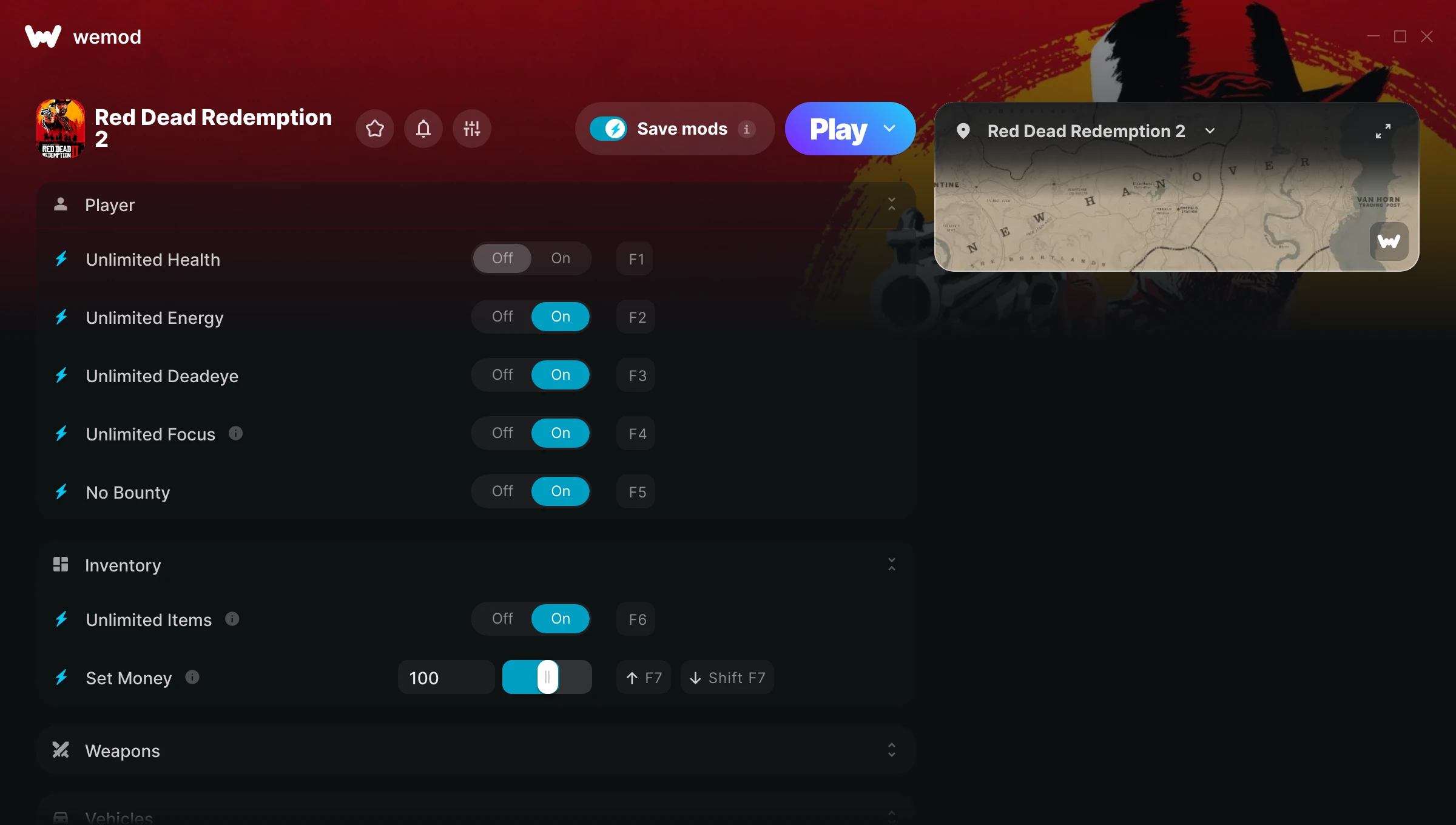 The only problem that I found is that some of the cheats won't turn off again once turned on. For example, I turned on infinite horse energy. Then I came across the mission where I had to tire out a horse so it could be ridden by a boy but I had to fully exit WeMod to be able to do it as the Infinite Horse Energy would not turn off.