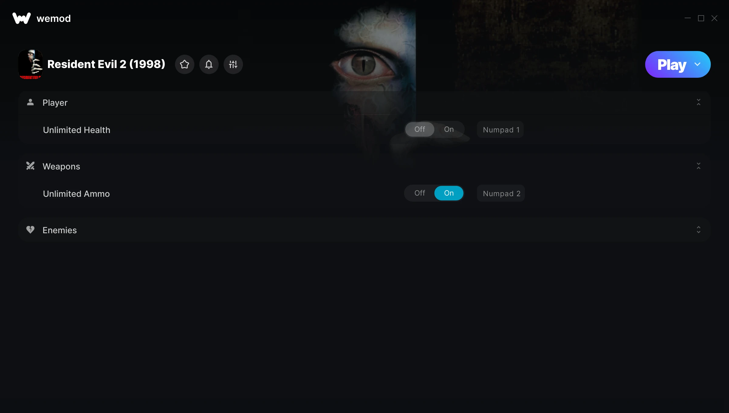 How do I use the cheats in Resident Evil 2 (1998)?WeMod will safely display all of the games on your PC. Open a game from the list and simply press play. After the game loads and once you’re in-game, you can start enabling different cheats!Will this work with my game version?WeMod uses advanced technology to detect the game version you’re running and will let you know if it’s supported. If it’s not, you will still have the option of giving it a try or requesting an update!