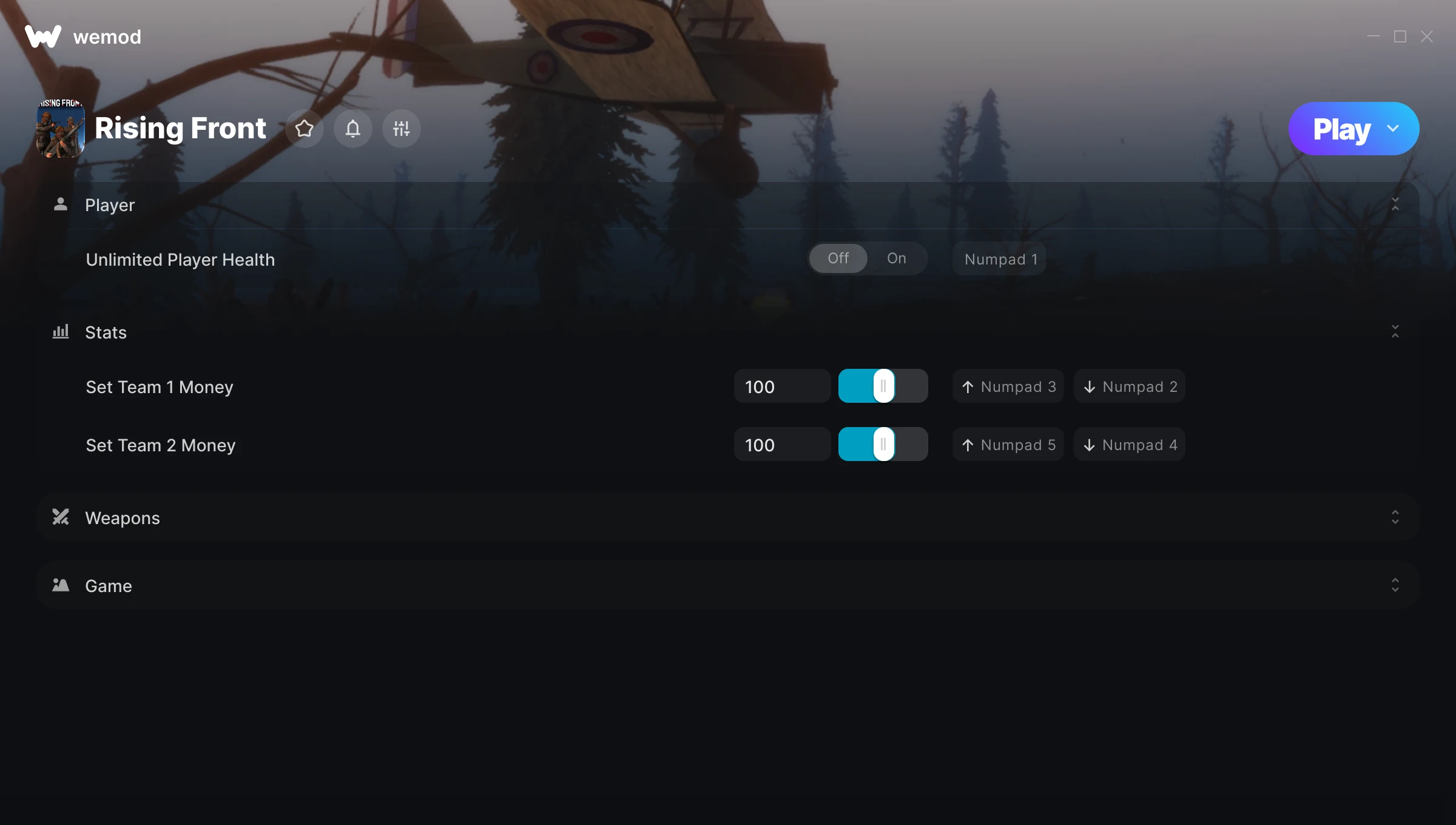 How do I use the cheats in Rising Front?WeMod will safely display all of the games on your PC. Open a game from the list and simply press play. After the game loads and once you’re in-game, you can start enabling different cheats!Will this work with my game version?WeMod uses advanced technology to detect the game version you’re running and will let you know if it’s supported. If it’s not, you will still have the option of giving it a try or requesting an update!