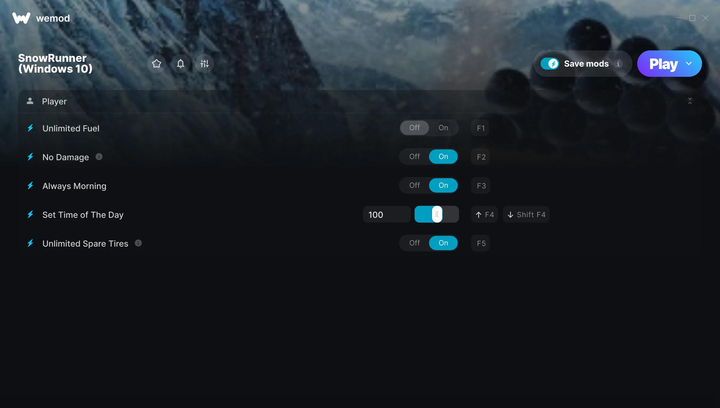 so much better not needing to worry about fuel every 10 to 15 minutes, but the no damage mod isnt working. also if you click on always morning, and you try to use time of day to set the time to 10 am lets say, the time will pass in the game as usual