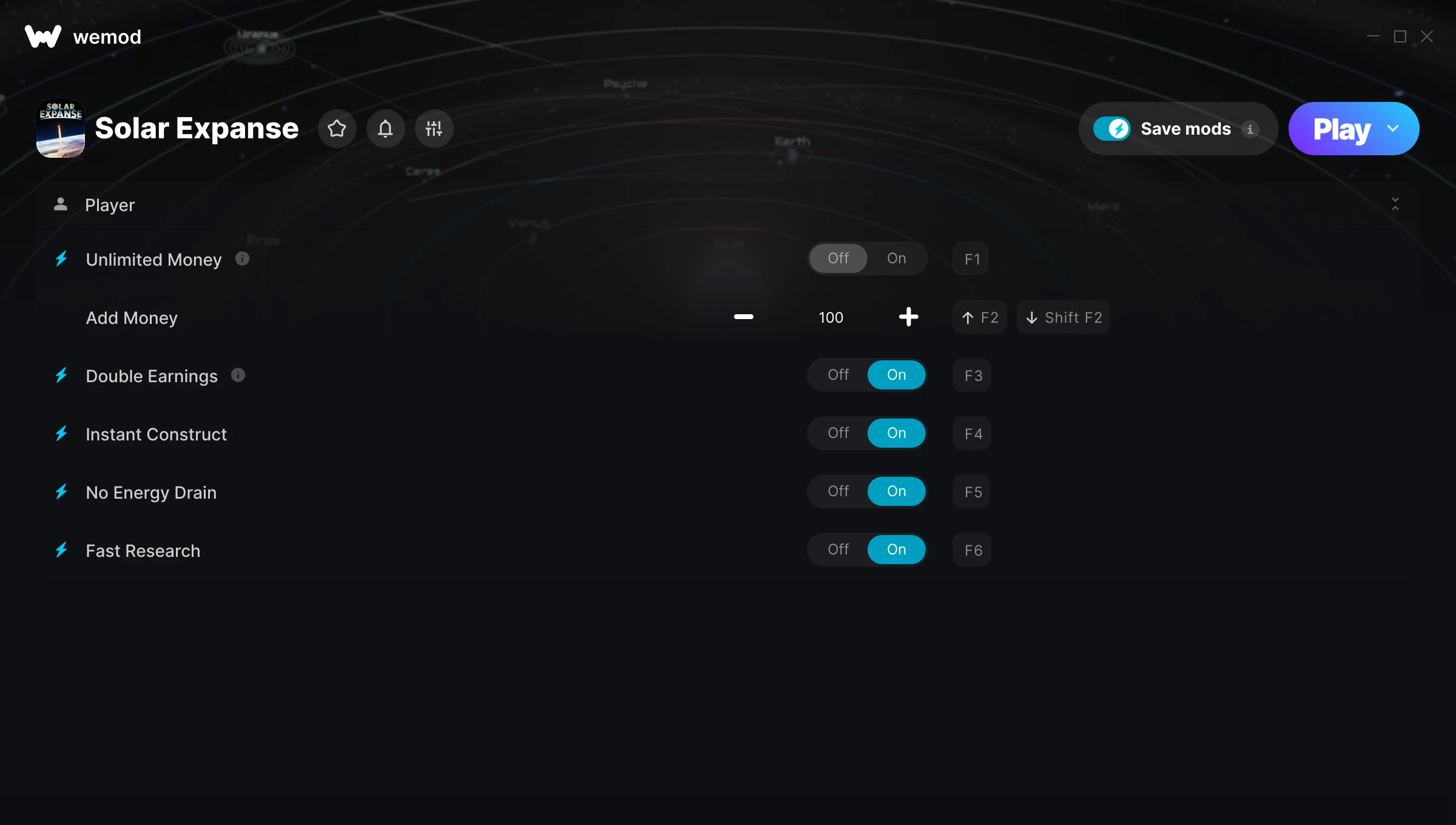 How do I use the cheats in Solar Expanse?WeMod will safely display all of the games on your PC. Open a game from the list and simply press play. After the game loads and once you’re in-game, you can start enabling different cheats!Will this work with my game version?WeMod uses advanced technology to detect the game version you’re running and will let you know if it’s supported. If it’s not, you will still have the option of giving it a try or requesting an update!