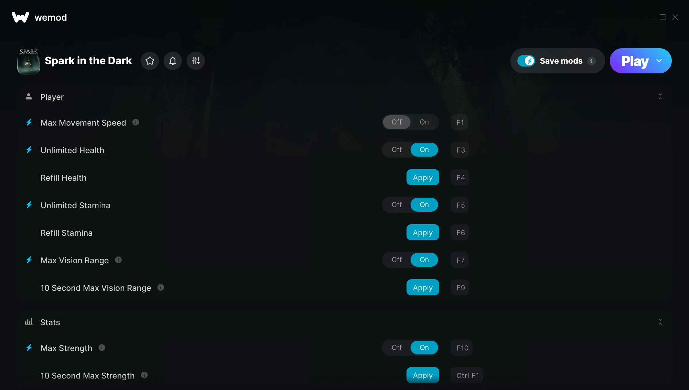 How do I use the cheats in Spark in the Dark?WeMod will safely display all of the games on your PC. Open a game from the list and simply press play. After the game loads and once you’re in-game, you can start enabling different cheats!Will this work with my game version?WeMod uses advanced technology to detect the game version you’re running and will let you know if it’s supported. If it’s not, you will still have the option of giving it a try or requesting an update!