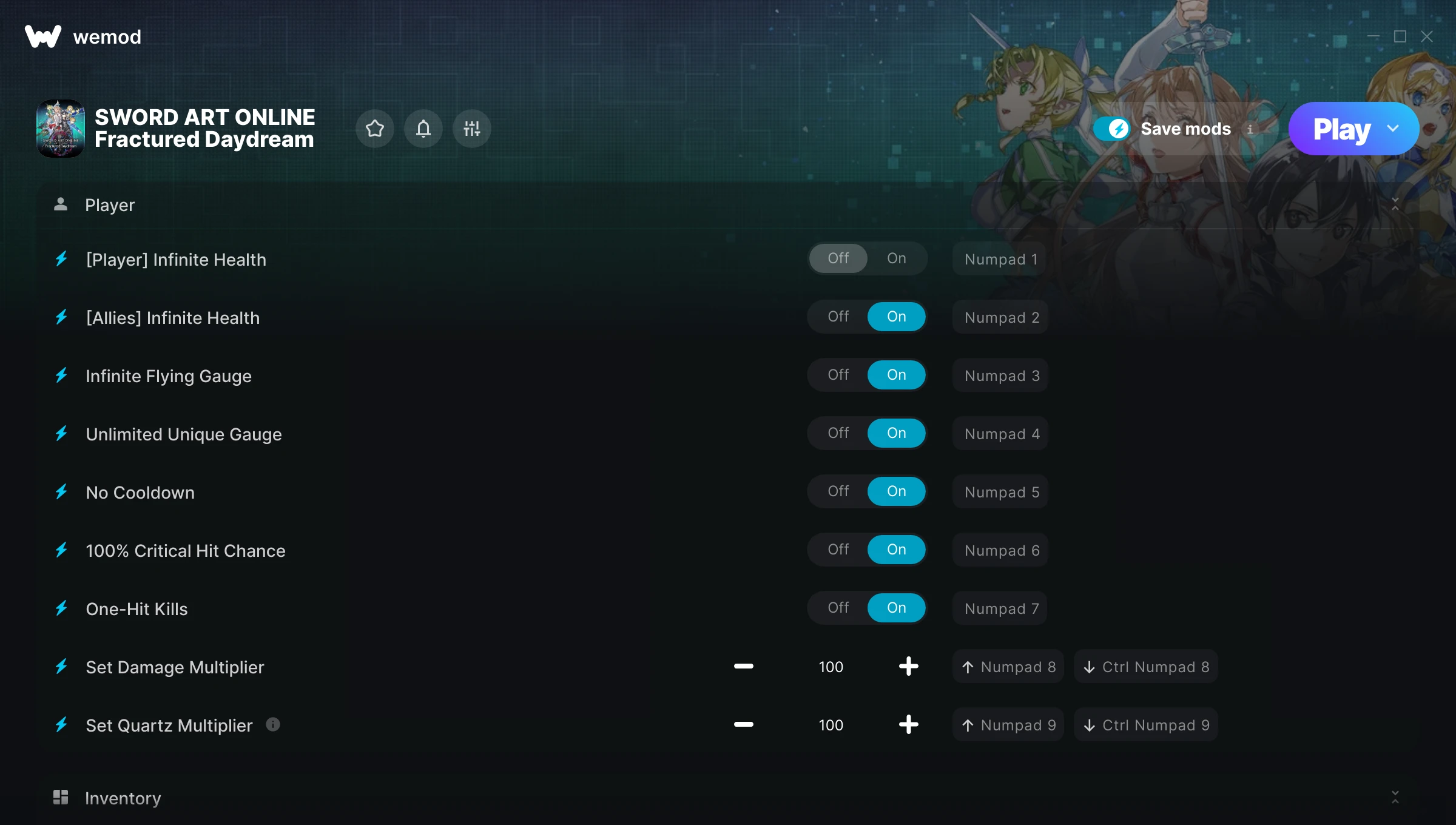 How do I use the cheats in SWORD ART ONLINE Fractured Daydream?WeMod will safely display all of the games on your PC. Open a game from the list and simply press play. After the game loads and once you’re in-game, you can start enabling different cheats!Will this work with my game version?WeMod uses advanced technology to detect the game version you’re running and will let you know if it’s supported. If it’s not, you will still have the option of giving it a try or requesting an update!