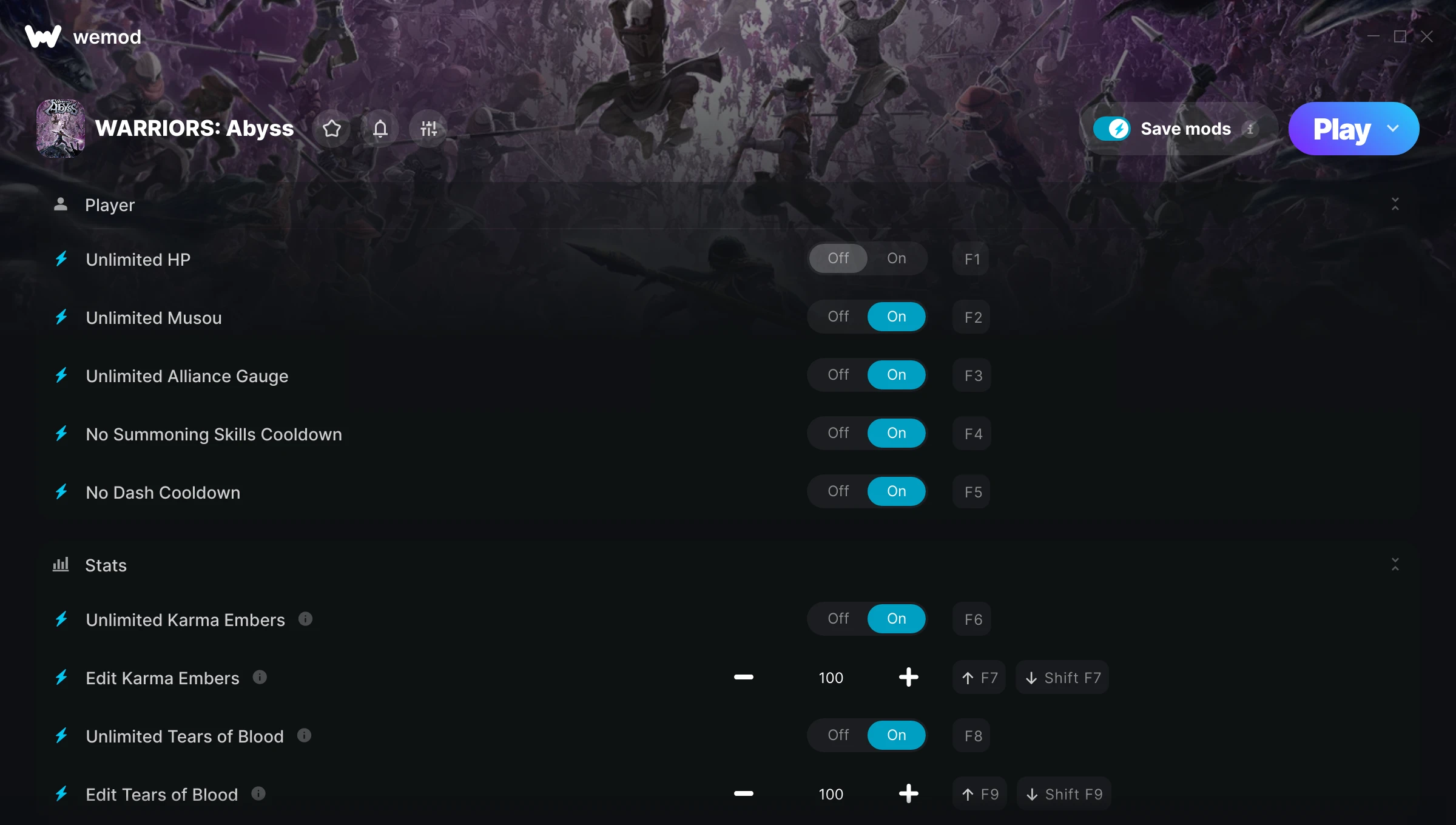 How do I use the cheats in WARRIORS: Abyss?WeMod will safely display all of the games on your PC. Open a game from the list and simply press play. After the game loads and once you’re in-game, you can start enabling different cheats!Will this work with my game version?WeMod uses advanced technology to detect the game version you’re running and will let you know if it’s supported. If it’s not, you will still have the option of giving it a try or requesting an update!