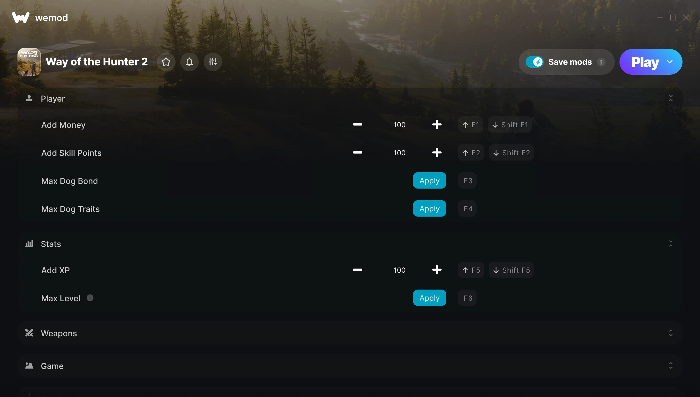 How do I use the cheats in Way of the Hunter 2?WeMod will safely display all of the games on your PC. Open a game from the list and simply press play. After the game loads and once you’re in-game, you can start enabling different cheats!Will this work with my game version?WeMod uses advanced technology to detect the game version you’re running and will let you know if it’s supported. If it’s not, you will still have the option of giving it a try or requesting an update!