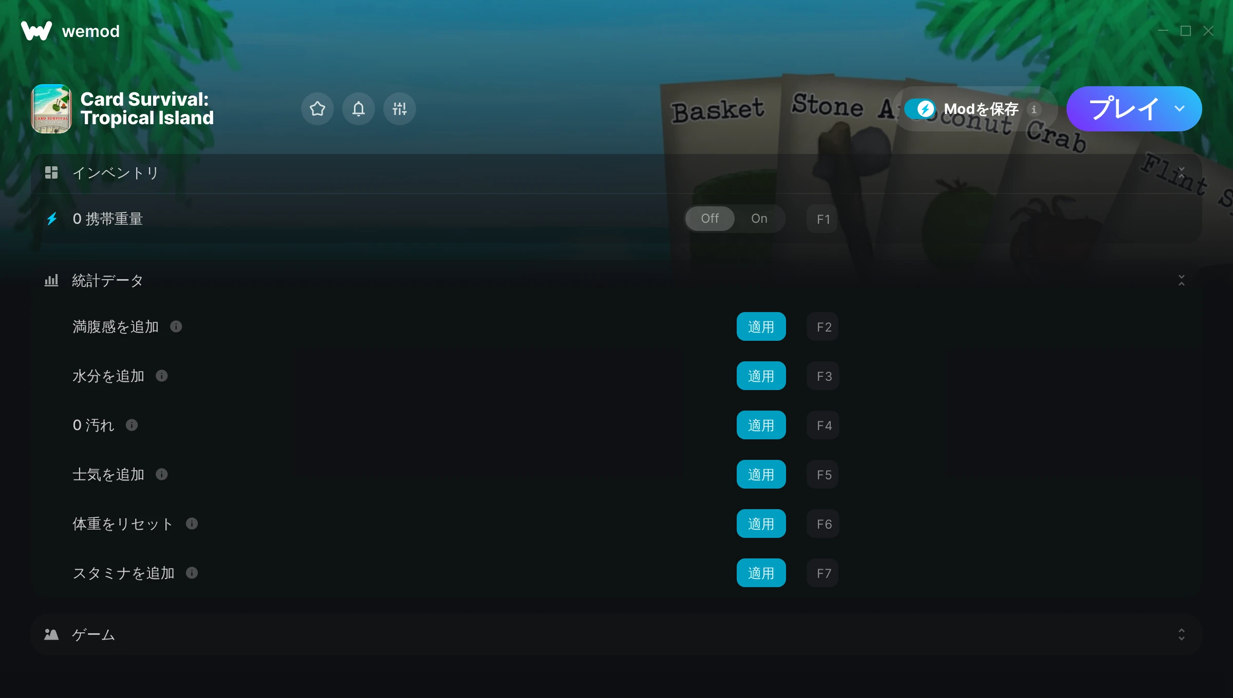 85MB Windows ...またはPCでWeModにアクセスしてアプリをダウンロード 0 携帯重量を入手, 満腹感を追加 & その他8件のMod for Card Survival: Tropical Island with WeMod