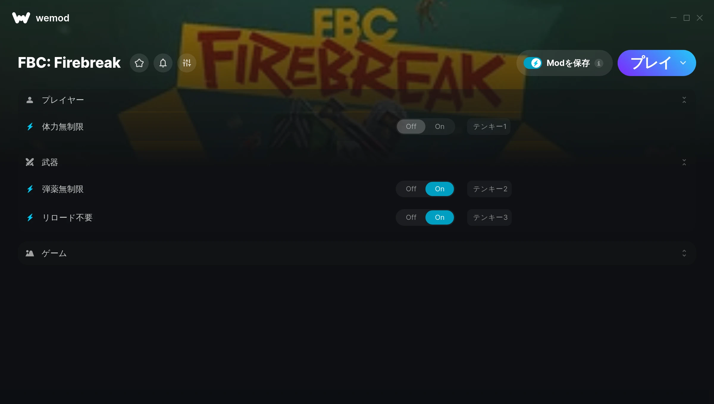 85MB Windows ...またはPCでWeModにアクセスしてアプリをダウンロード 体力無制限を入手, 弾薬無制限 & その他2件のMod for FBC: Firebreak with WeMod