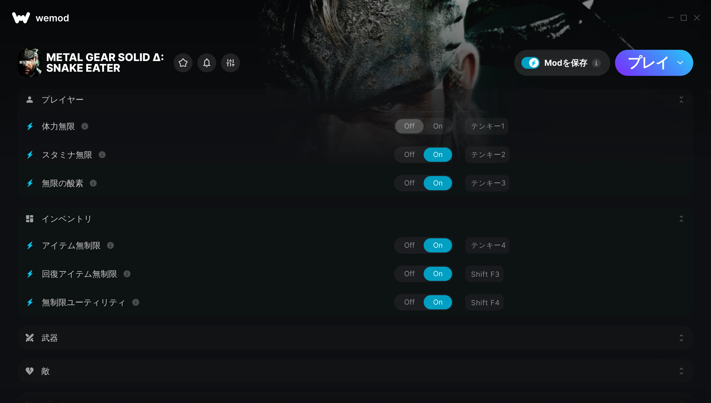 85MB Windows ...またはPCでWeModにアクセスしてアプリをダウンロード 体力無限を入手, スタミナ無限 & その他17件のMod for METAL GEAR SOLID Δ: SNAKE EATER with WeMod