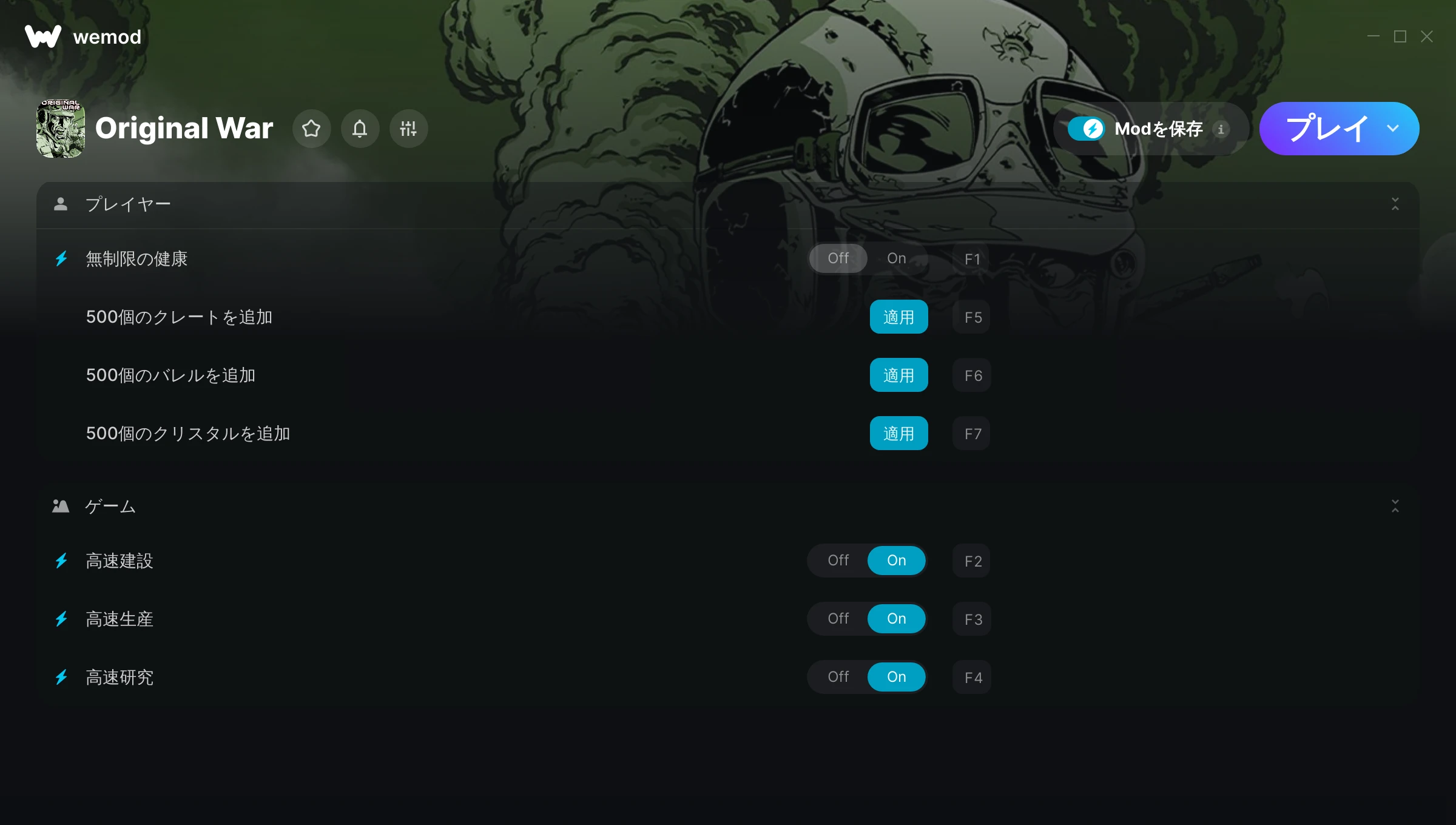 Original Warでチートを使うにはどうすればよいですか?WeModはすべてのゲームをPC上に安全に表現します。リストからゲームを開き、プレイを開始するだけです。ゲームが読み込まれ、ユーザーがゲーム内に入ると、さまざまなチートを有効化できるようになります!これは私のゲームのバージョンで動作しますか?WeModは高度な技術を使用して、実行中のゲームのバージョンを検知し、対応しているかどうかをユーザーに通知します。通知がなくても試してみることができますが、その場合はアップデートをリクエストしてみてください!