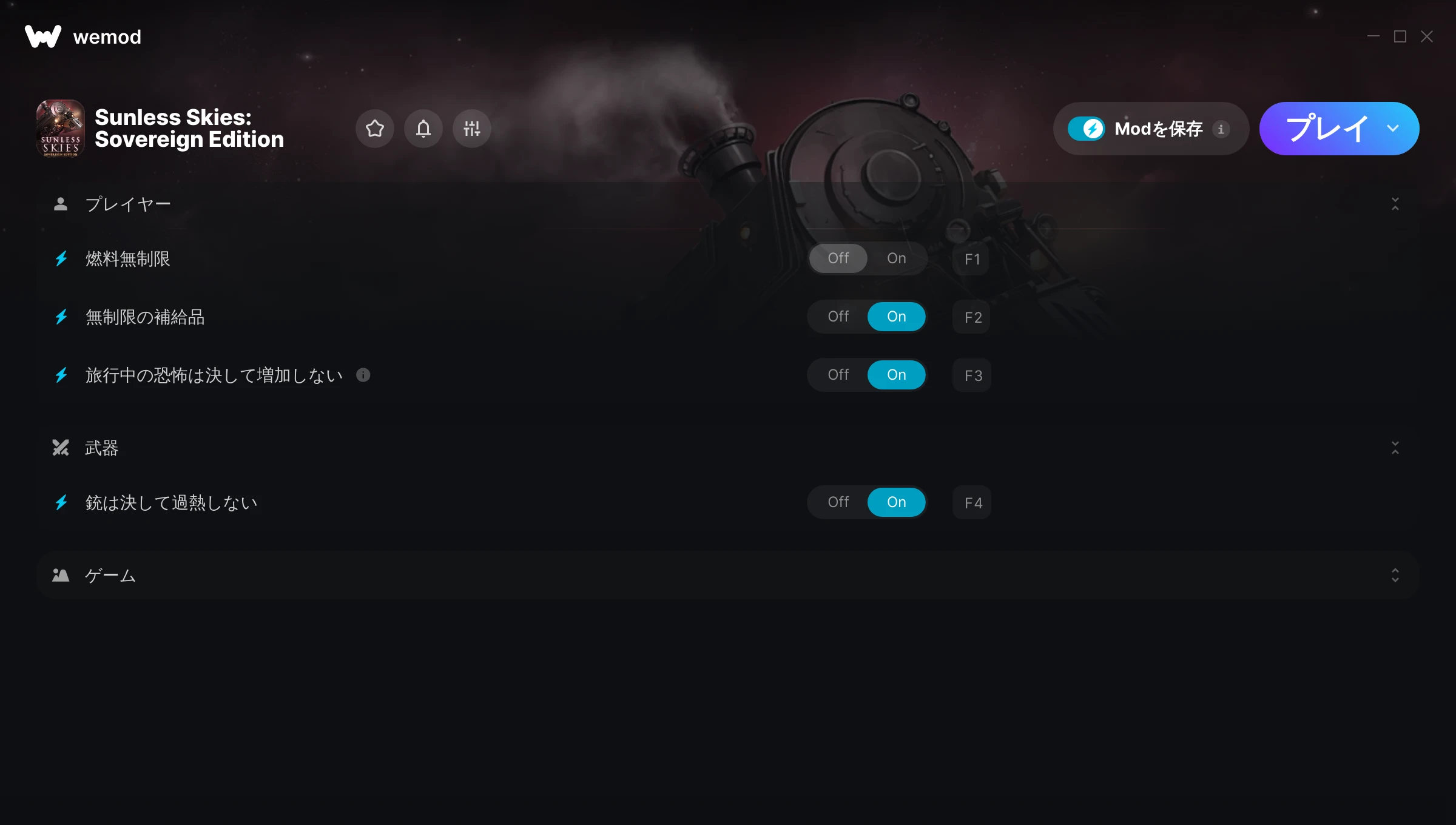 Sunless Skies: Sovereign Editionでチートを使うにはどうすればよいですか?WeModはすべてのゲームをPC上に安全に表現します。リストからゲームを開き、プレイを開始するだけです。ゲームが読み込まれ、ユーザーがゲーム内に入ると、さまざまなチートを有効化できるようになります!これは私のゲームのバージョンで動作しますか?WeModは高度な技術を使用して、実行中のゲームのバージョンを検知し、対応しているかどうかをユーザーに通知します。通知がなくても試してみることができますが、その場合はアップデートをリクエストしてみてください!