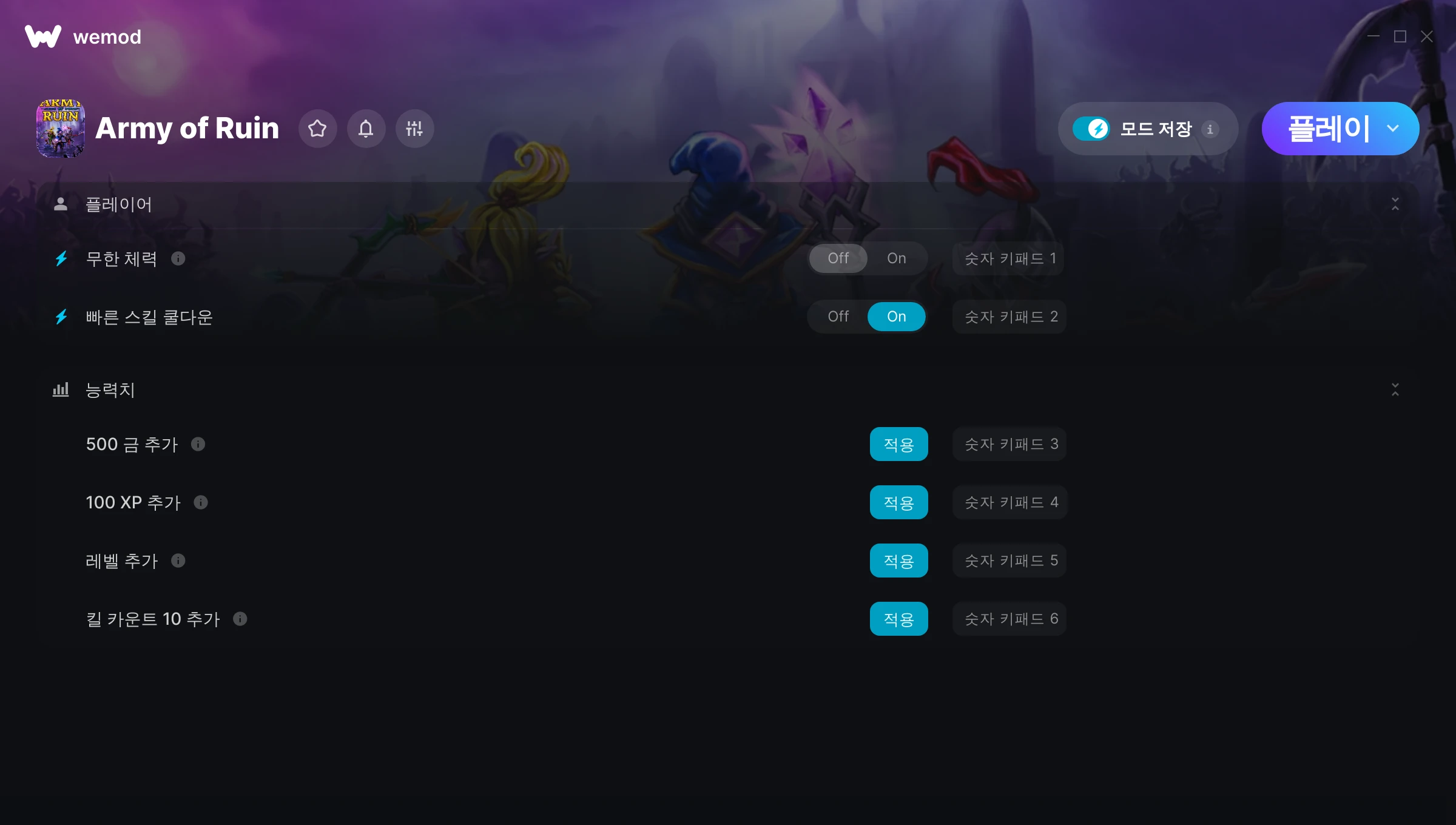 Army of Ruin에서 치트를 사용하려면 어떻게 해야 하나요?WeMod는 PC의 모든 게임을 표시합니다. 목록에서 게임을 선택하고 플레이를 누르세요. 게임을 시작하면 다양한 치트를 활성화할 수 있습니다!모드가 제 게임 버전과 호환될까요?WeMod는 고급 기술로 실행 중인 게임 버전을 탐지하고 모드 지원 여부를 표시합니다. 모드가 지원되지 않는다면 모드를 테스트해보거나 업데이트를 요청할 수 있습니다!