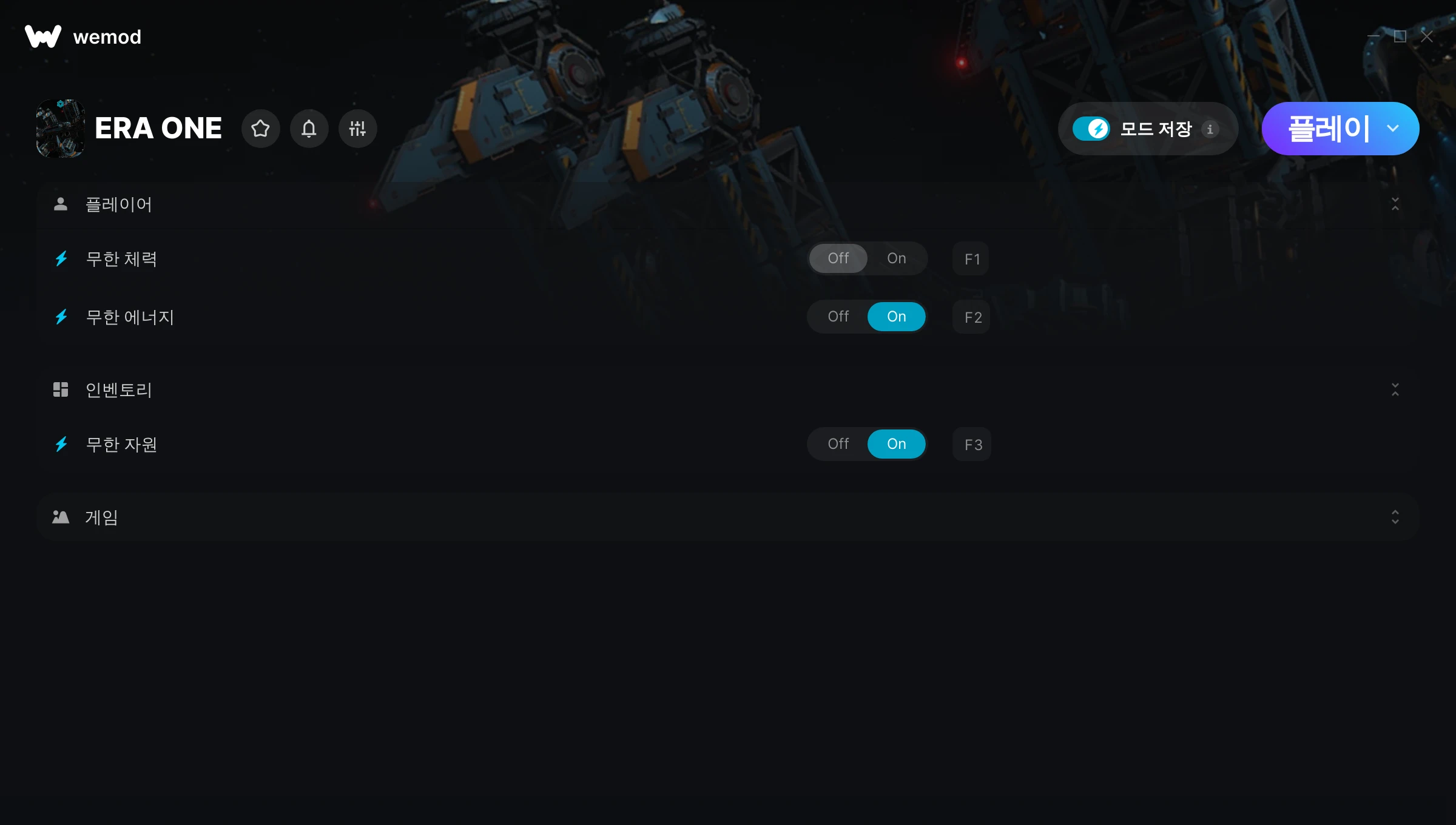 ERA ONE에서 치트를 사용하려면 어떻게 해야 하나요?WeMod는 PC의 모든 게임을 표시합니다. 목록에서 게임을 선택하고 플레이를 누르세요. 게임을 시작하면 다양한 치트를 활성화할 수 있습니다!모드가 제 게임 버전과 호환될까요?WeMod는 고급 기술로 실행 중인 게임 버전을 탐지하고 모드 지원 여부를 표시합니다. 모드가 지원되지 않는다면 모드를 테스트해보거나 업데이트를 요청할 수 있습니다!