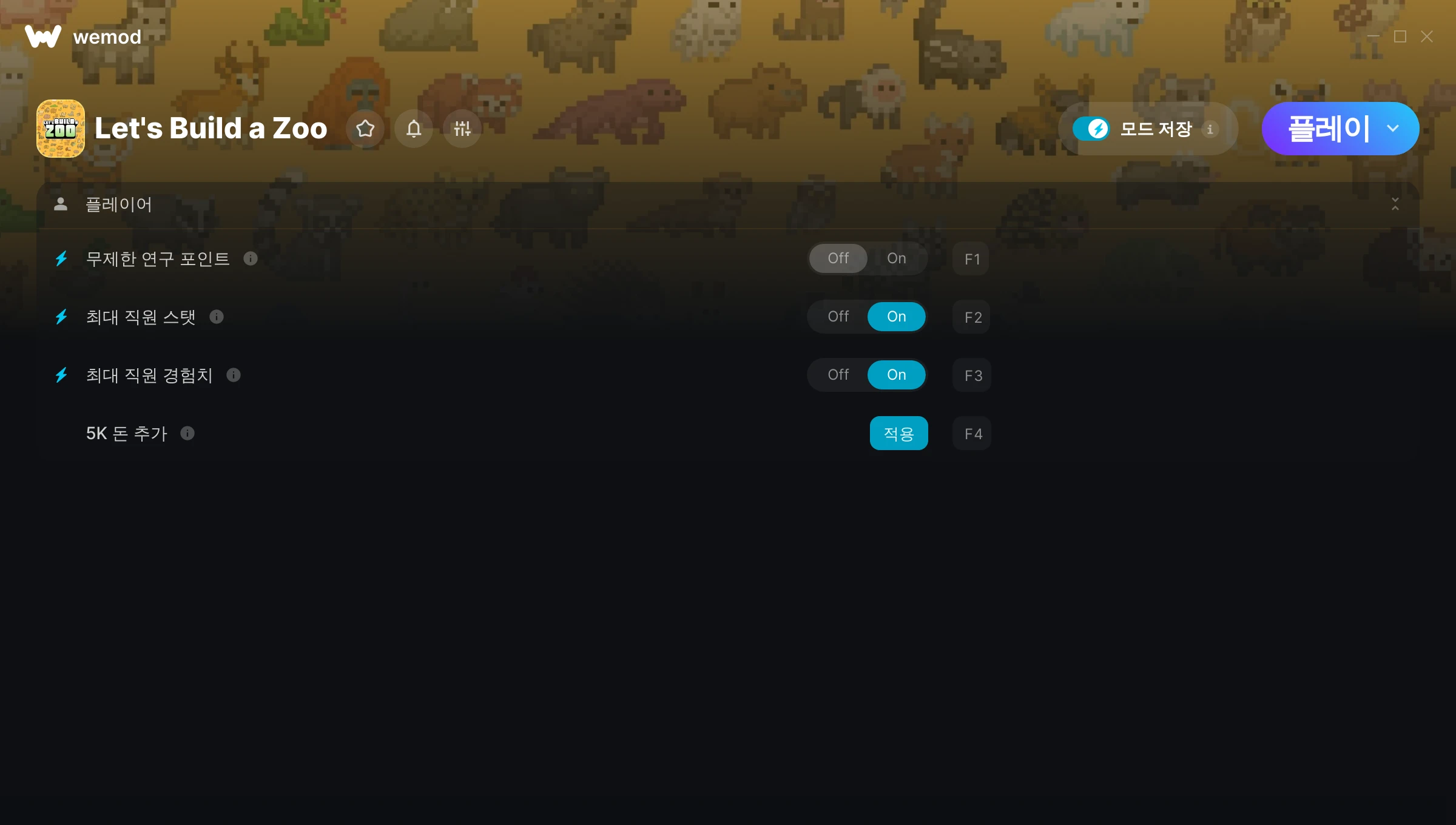 Let's Build a Zoo에서 치트를 사용하려면 어떻게 해야 하나요?WeMod는 PC의 모든 게임을 표시합니다. 목록에서 게임을 선택하고 플레이를 누르세요. 게임을 시작하면 다양한 치트를 활성화할 수 있습니다!모드가 제 게임 버전과 호환될까요?WeMod는 고급 기술로 실행 중인 게임 버전을 탐지하고 모드 지원 여부를 표시합니다. 모드가 지원되지 않는다면 모드를 테스트해보거나 업데이트를 요청할 수 있습니다!
