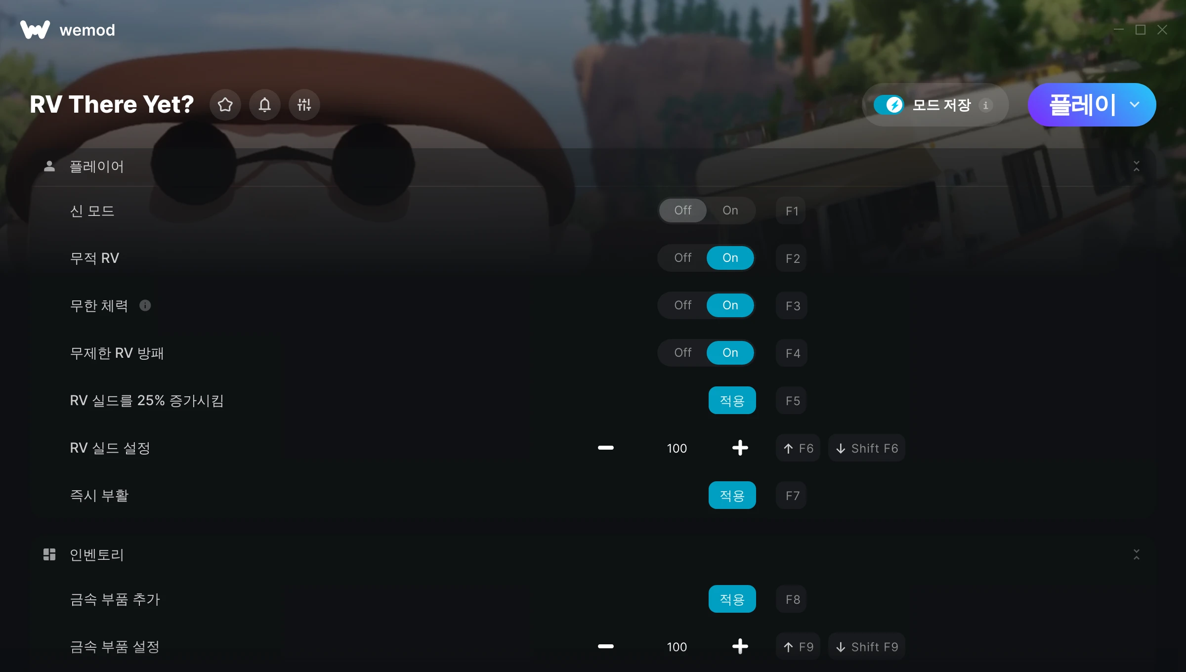 RV There Yet?에서 치트를 사용하려면 어떻게 해야 하나요?WeMod는 PC의 모든 게임을 표시합니다. 목록에서 게임을 선택하고 플레이를 누르세요. 게임을 시작하면 다양한 치트를 활성화할 수 있습니다!모드가 제 게임 버전과 호환될까요?WeMod는 고급 기술로 실행 중인 게임 버전을 탐지하고 모드 지원 여부를 표시합니다. 모드가 지원되지 않는다면 모드를 테스트해보거나 업데이트를 요청할 수 있습니다!