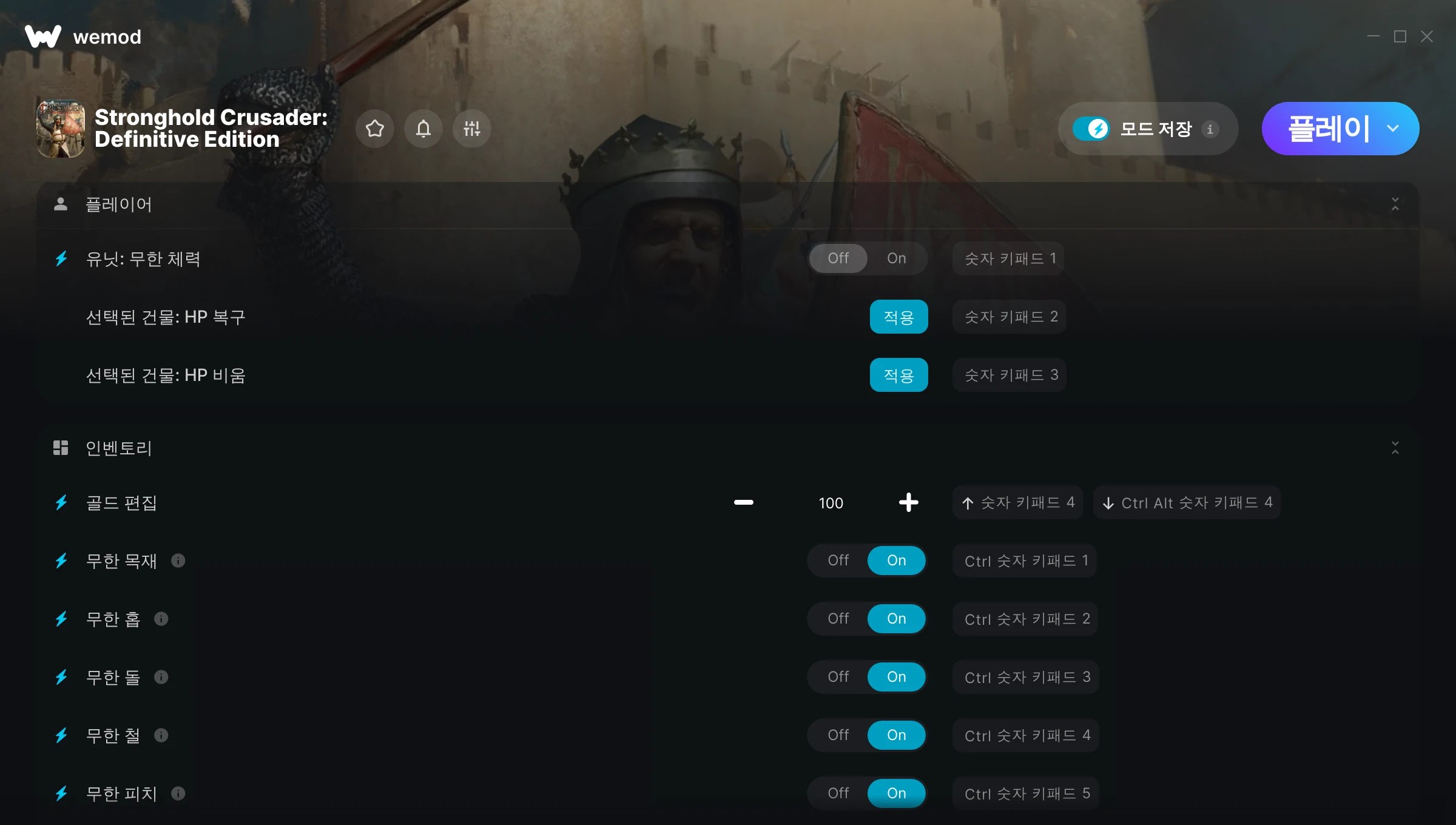 Stronghold Crusader: Definitive Edition에서 치트를 사용하려면 어떻게 해야 하나요?WeMod는 PC의 모든 게임을 표시합니다. 목록에서 게임을 선택하고 플레이를 누르세요. 게임을 시작하면 다양한 치트를 활성화할 수 있습니다!모드가 제 게임 버전과 호환될까요?WeMod는 고급 기술로 실행 중인 게임 버전을 탐지하고 모드 지원 여부를 표시합니다. 모드가 지원되지 않는다면 모드를 테스트해보거나 업데이트를 요청할 수 있습니다!