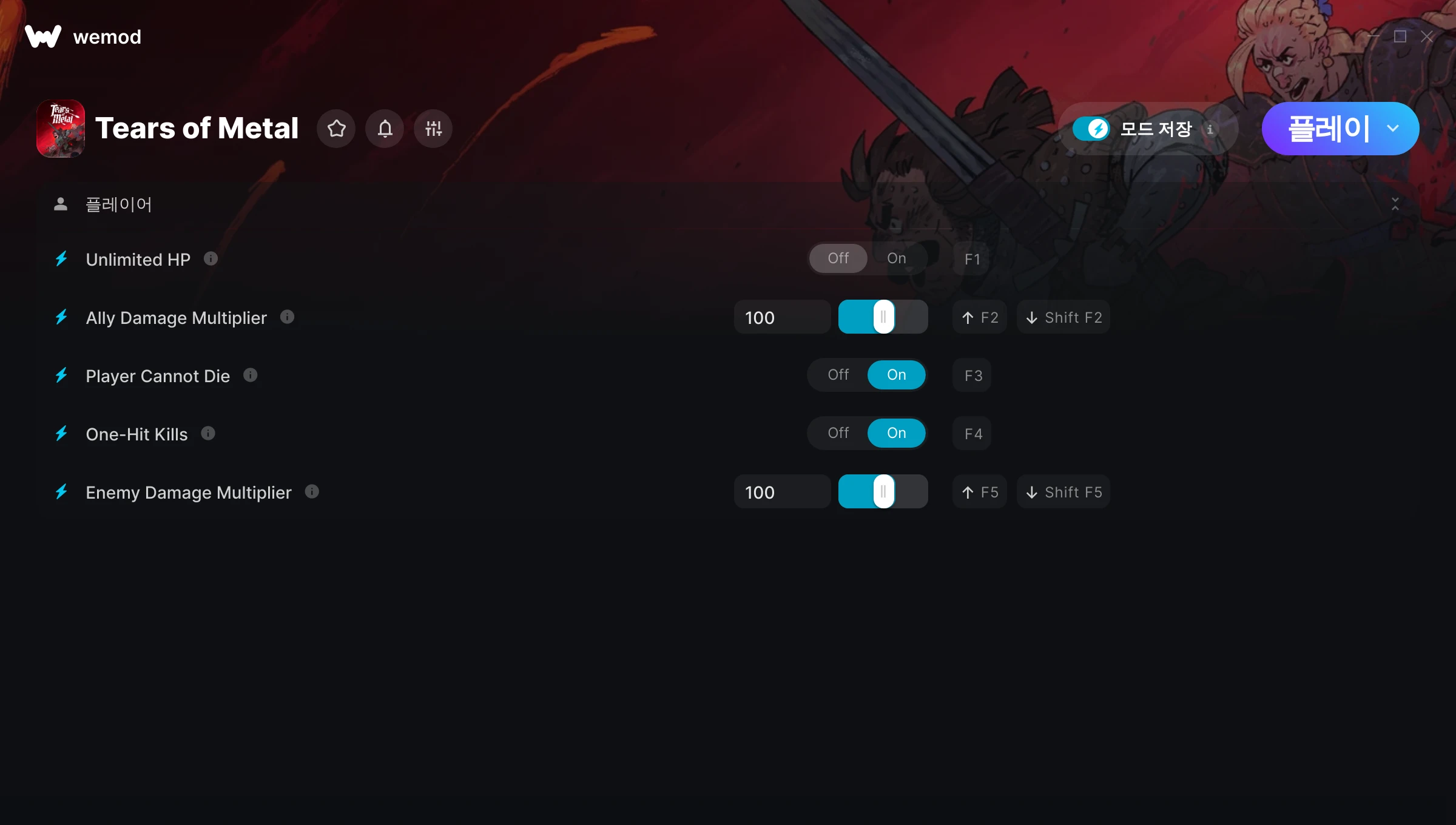 Tears of Metal에서 치트를 사용하려면 어떻게 해야 하나요?WeMod는 PC의 모든 게임을 표시합니다. 목록에서 게임을 선택하고 플레이를 누르세요. 게임을 시작하면 다양한 치트를 활성화할 수 있습니다!모드가 제 게임 버전과 호환될까요?WeMod는 고급 기술로 실행 중인 게임 버전을 탐지하고 모드 지원 여부를 표시합니다. 모드가 지원되지 않는다면 모드를 테스트해보거나 업데이트를 요청할 수 있습니다!