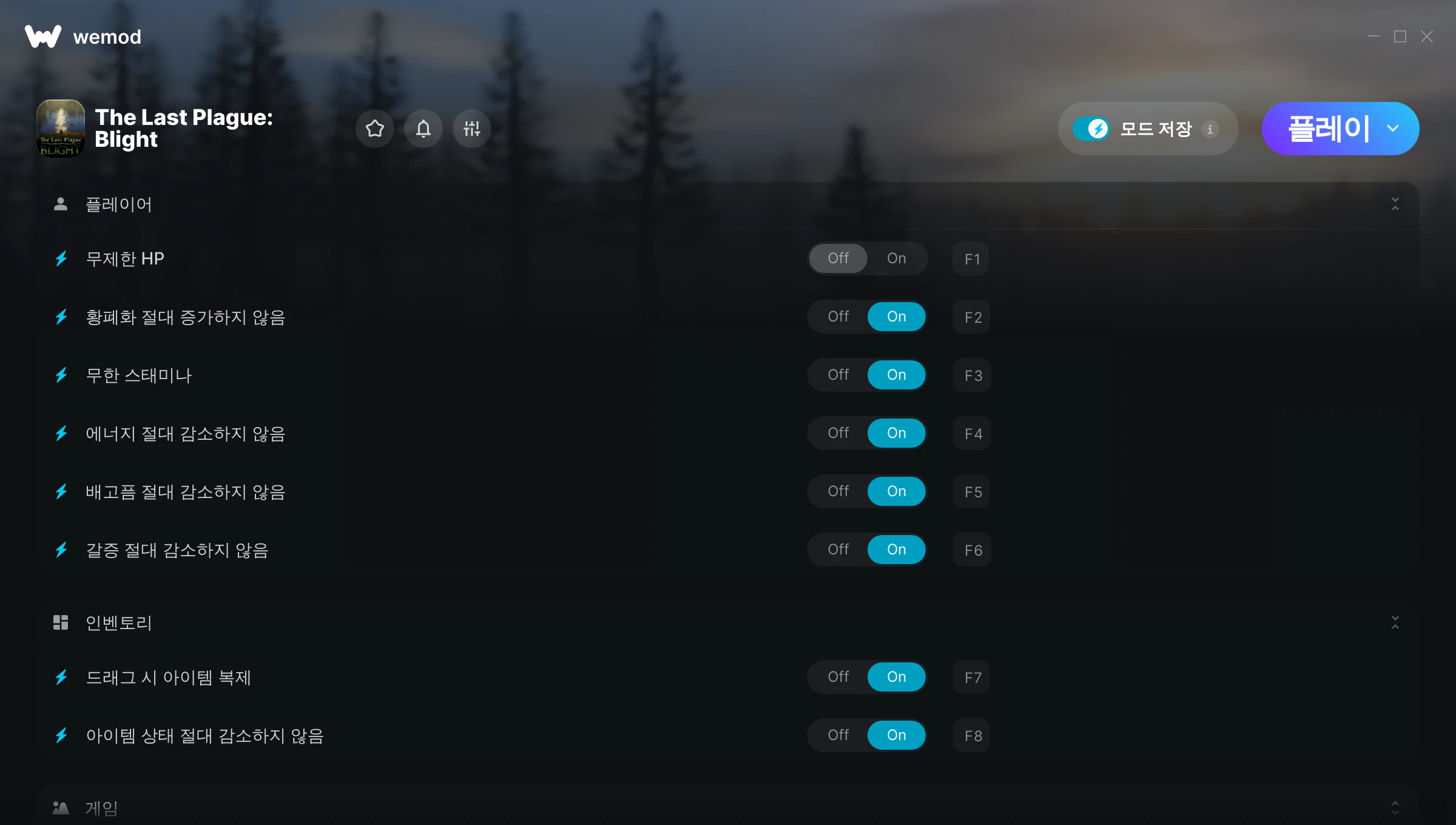 The Last Plague: Blight에서 치트를 사용하려면 어떻게 해야 하나요?WeMod는 PC의 모든 게임을 표시합니다. 목록에서 게임을 선택하고 플레이를 누르세요. 게임을 시작하면 다양한 치트를 활성화할 수 있습니다!모드가 제 게임 버전과 호환될까요?WeMod는 고급 기술로 실행 중인 게임 버전을 탐지하고 모드 지원 여부를 표시합니다. 모드가 지원되지 않는다면 모드를 테스트해보거나 업데이트를 요청할 수 있습니다!