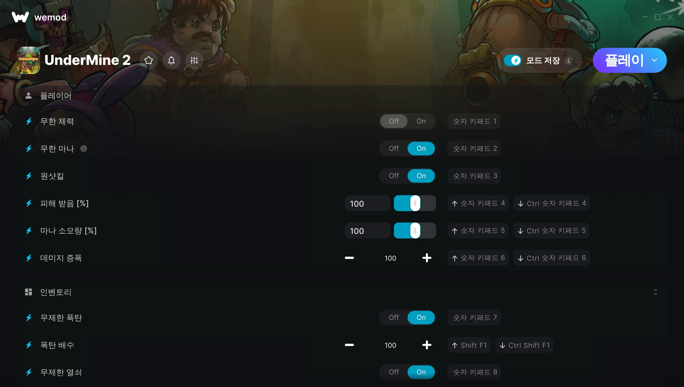 UnderMine 2에서 치트를 사용하려면 어떻게 해야 하나요?WeMod는 PC의 모든 게임을 표시합니다. 목록에서 게임을 선택하고 플레이를 누르세요. 게임을 시작하면 다양한 치트를 활성화할 수 있습니다!모드가 제 게임 버전과 호환될까요?WeMod는 고급 기술로 실행 중인 게임 버전을 탐지하고 모드 지원 여부를 표시합니다. 모드가 지원되지 않는다면 모드를 테스트해보거나 업데이트를 요청할 수 있습니다!