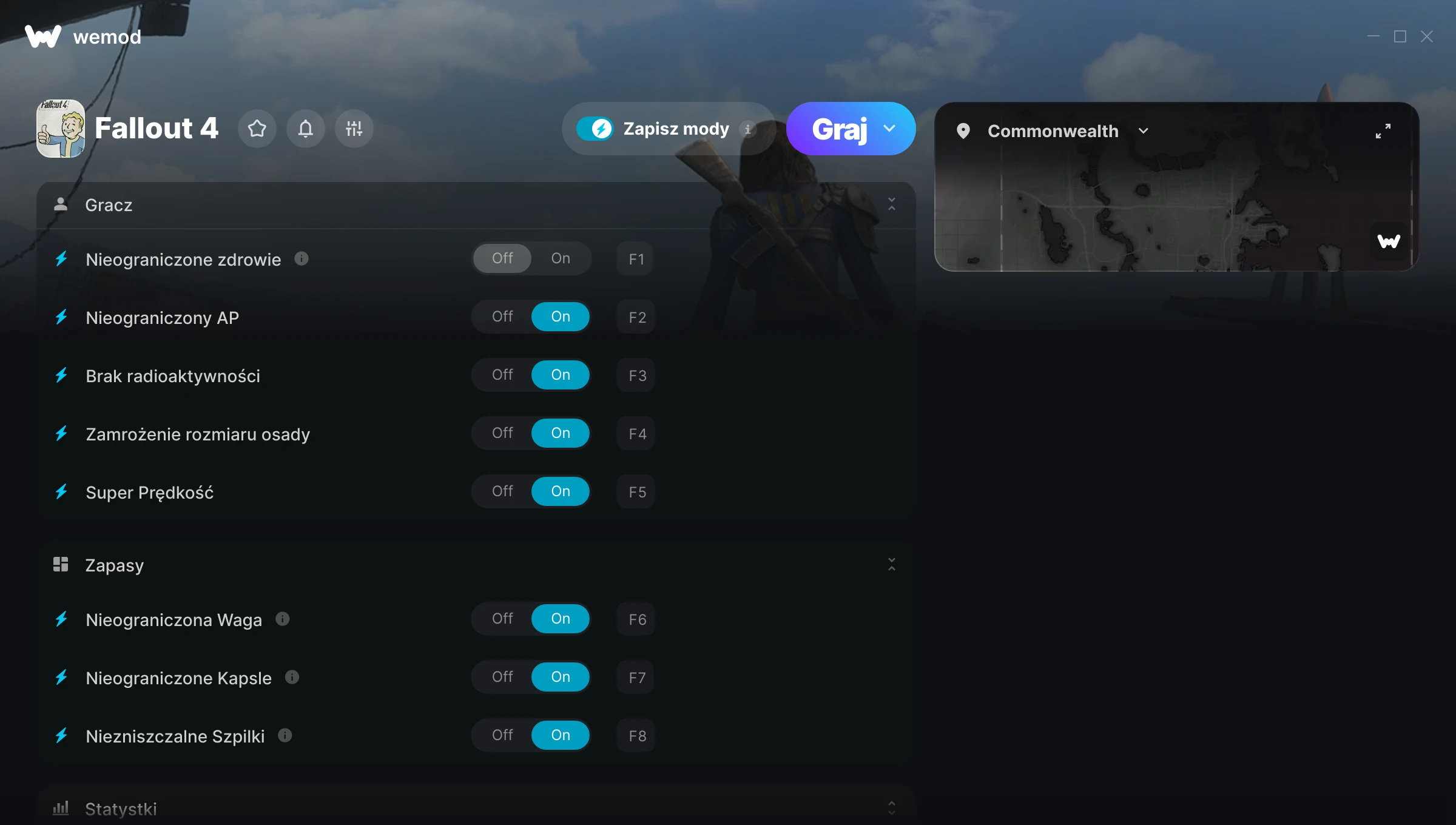 have always enjoyed wemod and the trainers on here work wonderfully especially this one without it idk that i would play the game still since i have beaten so many times already but between mods and this trainer for fallout 4 it works out great