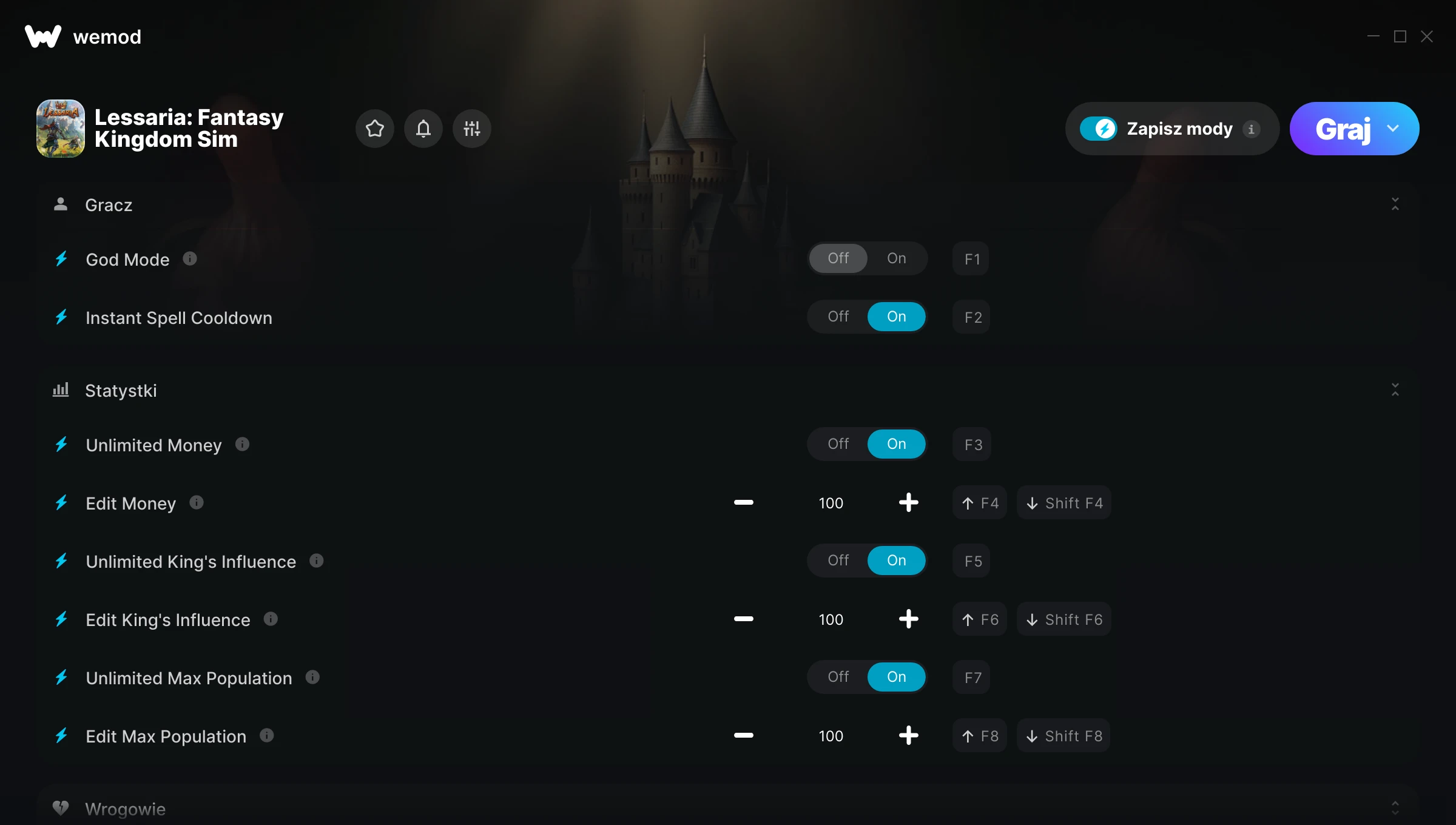 WeMod będzie bezpiecznie wyświetlał wszystkie gry na Twoim komputerze. Otwórz grę z listy i po prostu naciśnij „graj”. Po uruchomieniu gry możesz włączać różne cheaty!