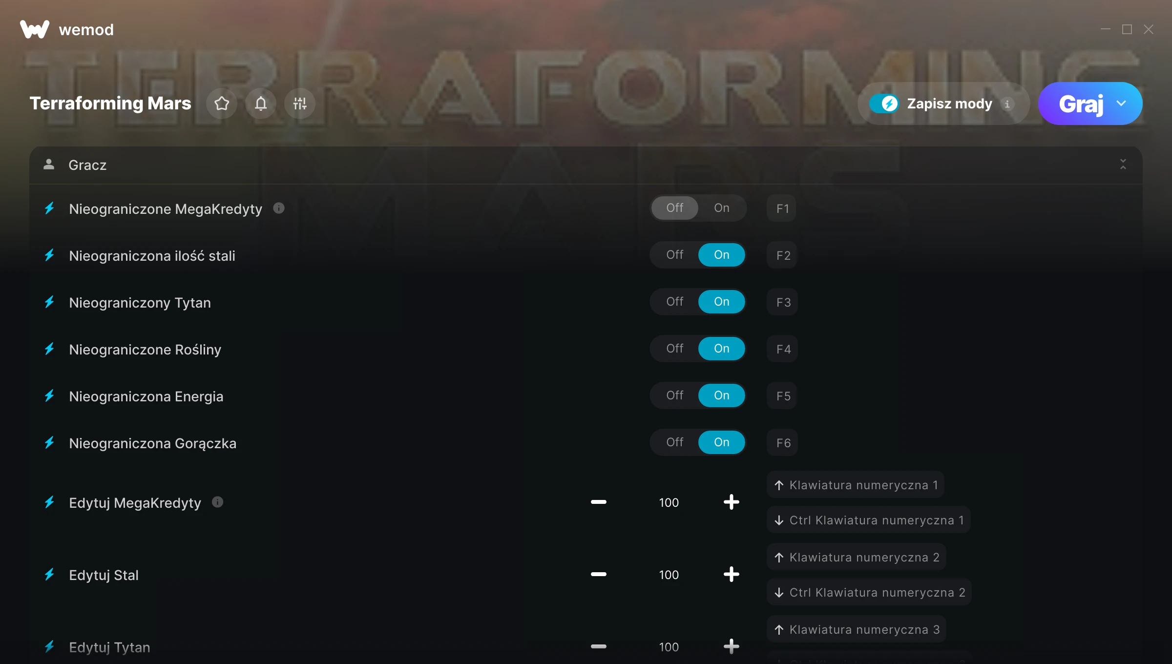 Dowiedz się więcejWeMod jest zawsze bezpieczny i darmowy dzięki naszej wielomilionowej społeczności graczy na całym świecie. Jesteśmy wspierani przez subskrybentów WeMod Pro. Sprawdź nasze recenzje na Trustpilot.