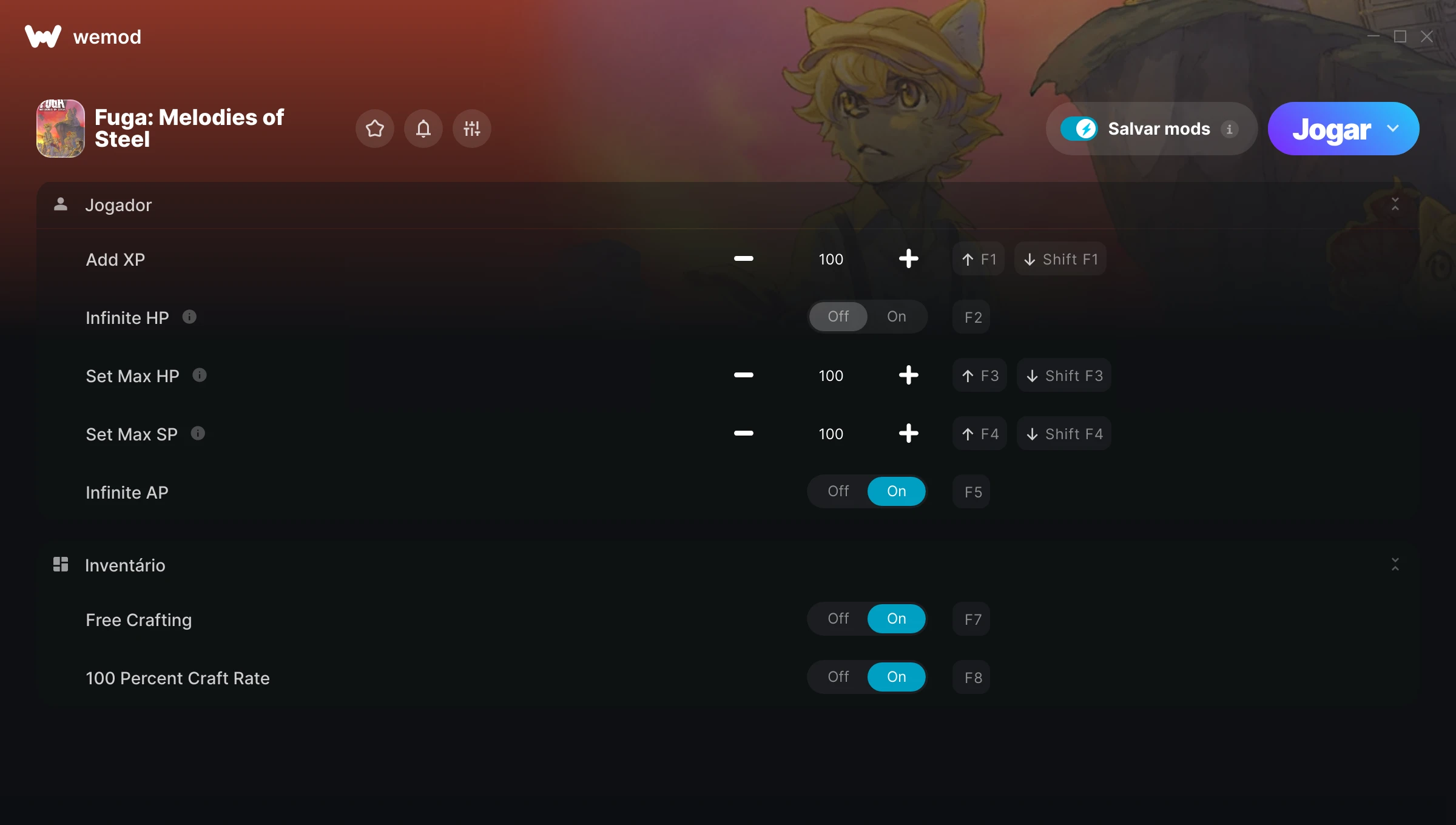 Como uso as trapaças em Fuga: Melodies of Steel?O WeMod exibirá todos os jogos no seu PC com segurança. Abra um jogo da lista e simplesmente pressione Jogar. Depois que o jogo for carregado e você estiver no jogo, você poderá começar a ativar diferentes trapaças!Vai funcionar com a minha versão do jogo?O WeMod usa tecnologia avançada para detectar a versão do jogo que você está rodando e avisar se é suportada. Se não for, você ainda terá a opção de tentar assim mesmo ou solicitar uma atualização!