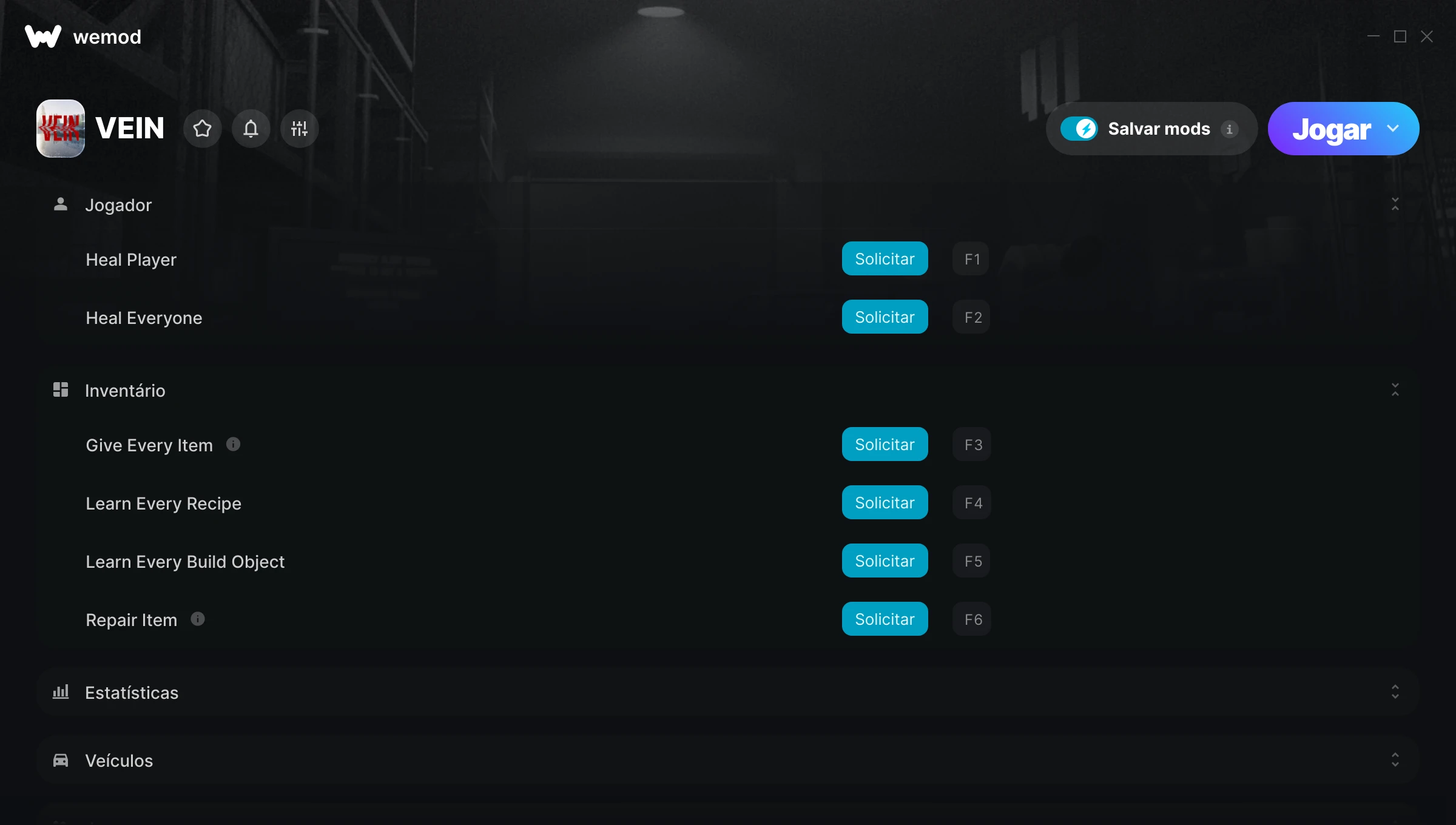 Como uso as trapaças em VEIN?O WeMod exibirá todos os jogos no seu PC com segurança. Abra um jogo da lista e simplesmente pressione Jogar. Depois que o jogo for carregado e você estiver no jogo, você poderá começar a ativar diferentes trapaças!Vai funcionar com a minha versão do jogo?O WeMod usa tecnologia avançada para detectar a versão do jogo que você está rodando e avisar se é suportada. Se não for, você ainda terá a opção de tentar assim mesmo ou solicitar uma atualização!