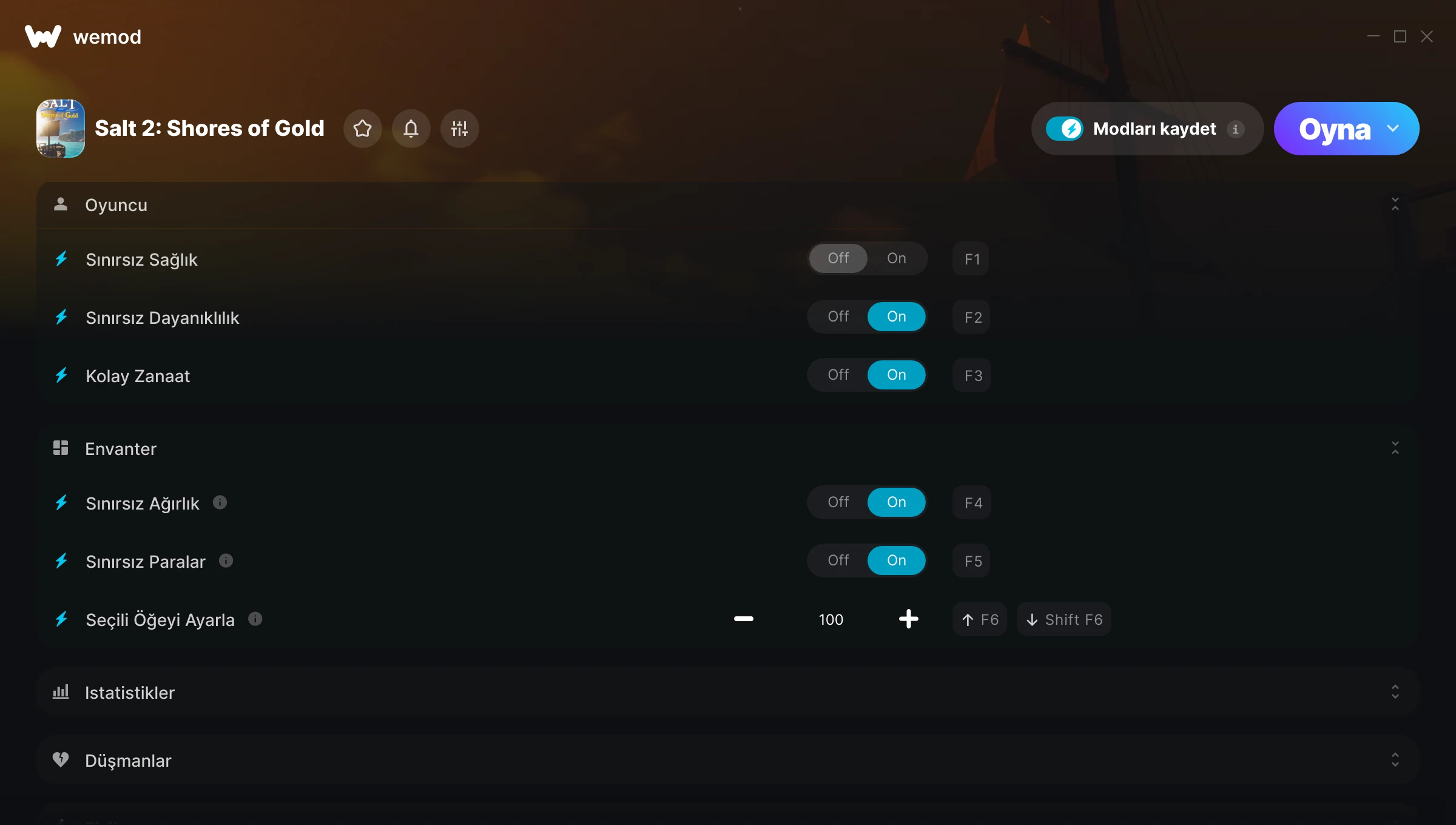 85MB Windows ...veya uygulamayı indirmek için bizi bilgisayarından ziyaret et Sınırsız Sağlık Edinin, Sınırsız Dayanıklılık & 8 diğer mod for Salt 2: Shores of Gold with WeMod