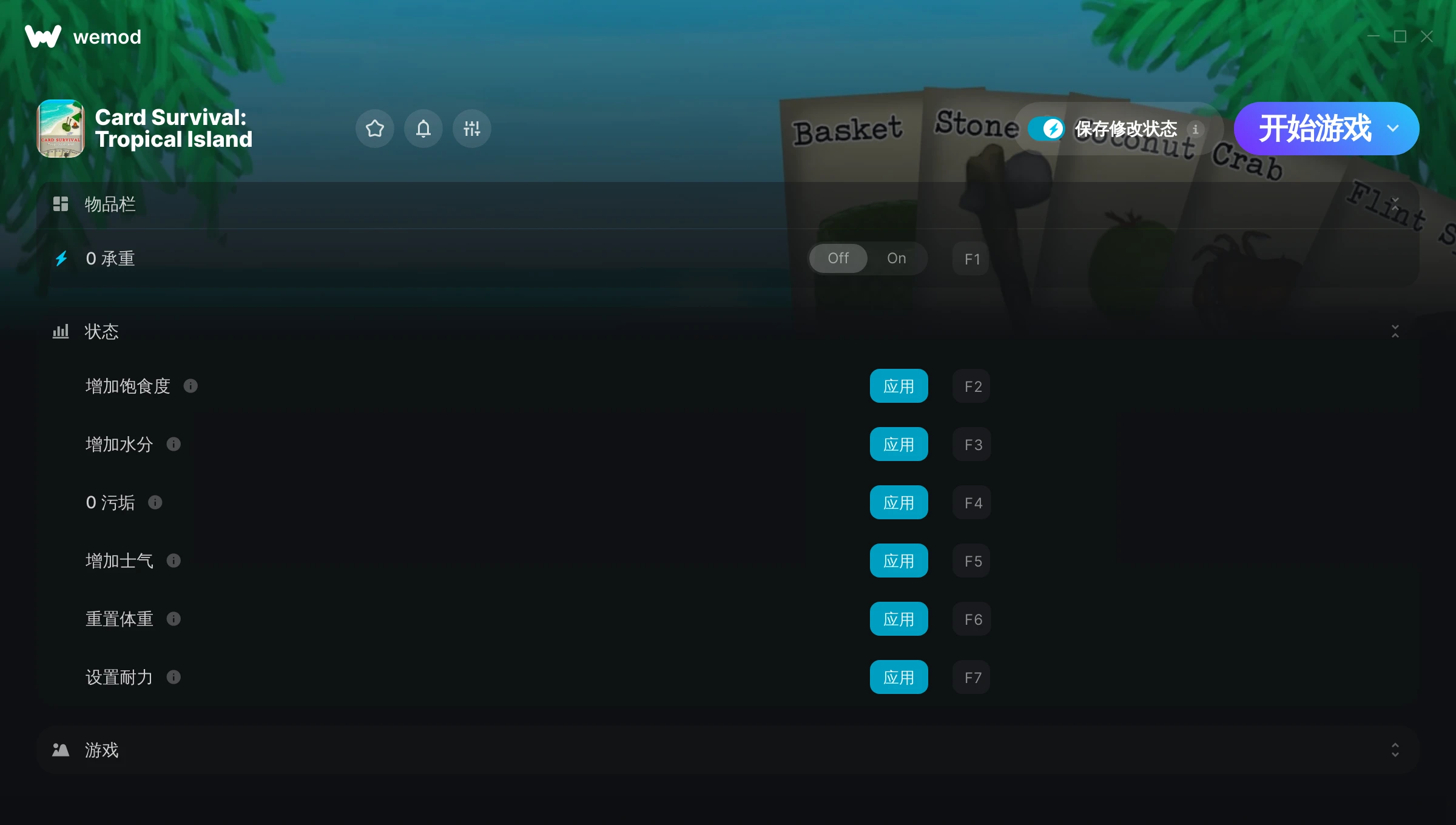 如何在 Card Survival: Tropical Island 中使用修改器?WeMod 会安全地扫描并显示你的 PC 上已安装的所有游戏。只需从列表中选择一款游戏并点击“开始游戏”,即可快速启动游戏。当游戏完成加载并进入游戏画面后,你就可以开启各种修改了!这些修改适用于我的游戏版本吗?WeMod 还能使用先进技术自动检测你的游戏版本,并告知你该游戏是否支持修改。如果暂无修改,你可以选择直接进入游戏或提交制作申请!