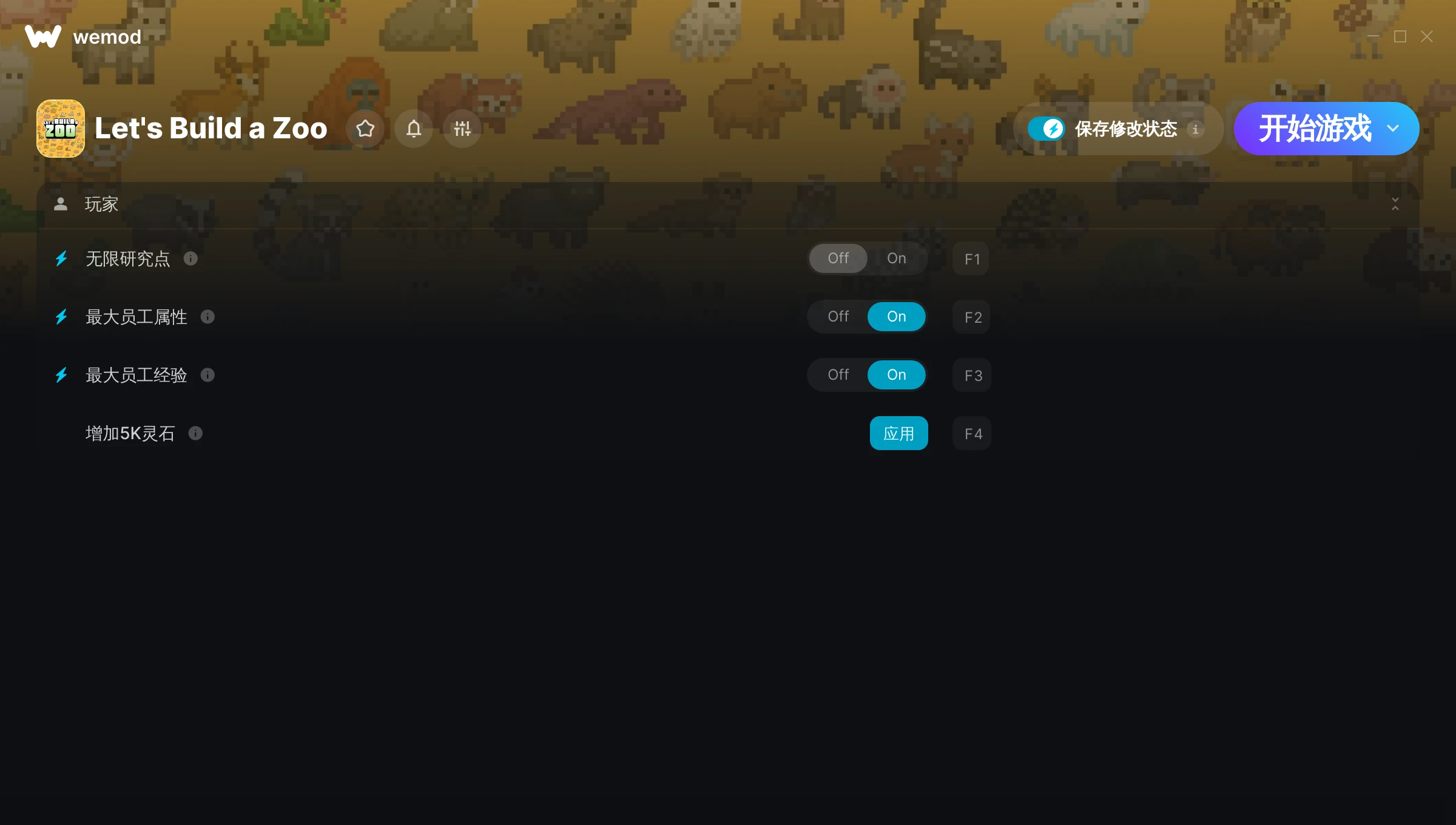 如何在 Let's Build a Zoo 中使用修改器?WeMod 会安全地扫描并显示你的 PC 上已安装的所有游戏。只需从列表中选择一款游戏并点击“开始游戏”,即可快速启动游戏。当游戏完成加载并进入游戏画面后,你就可以开启各种修改了!这些修改适用于我的游戏版本吗?WeMod 还能使用先进技术自动检测你的游戏版本,并告知你该游戏是否支持修改。如果暂无修改,你可以选择直接进入游戏或提交制作申请!